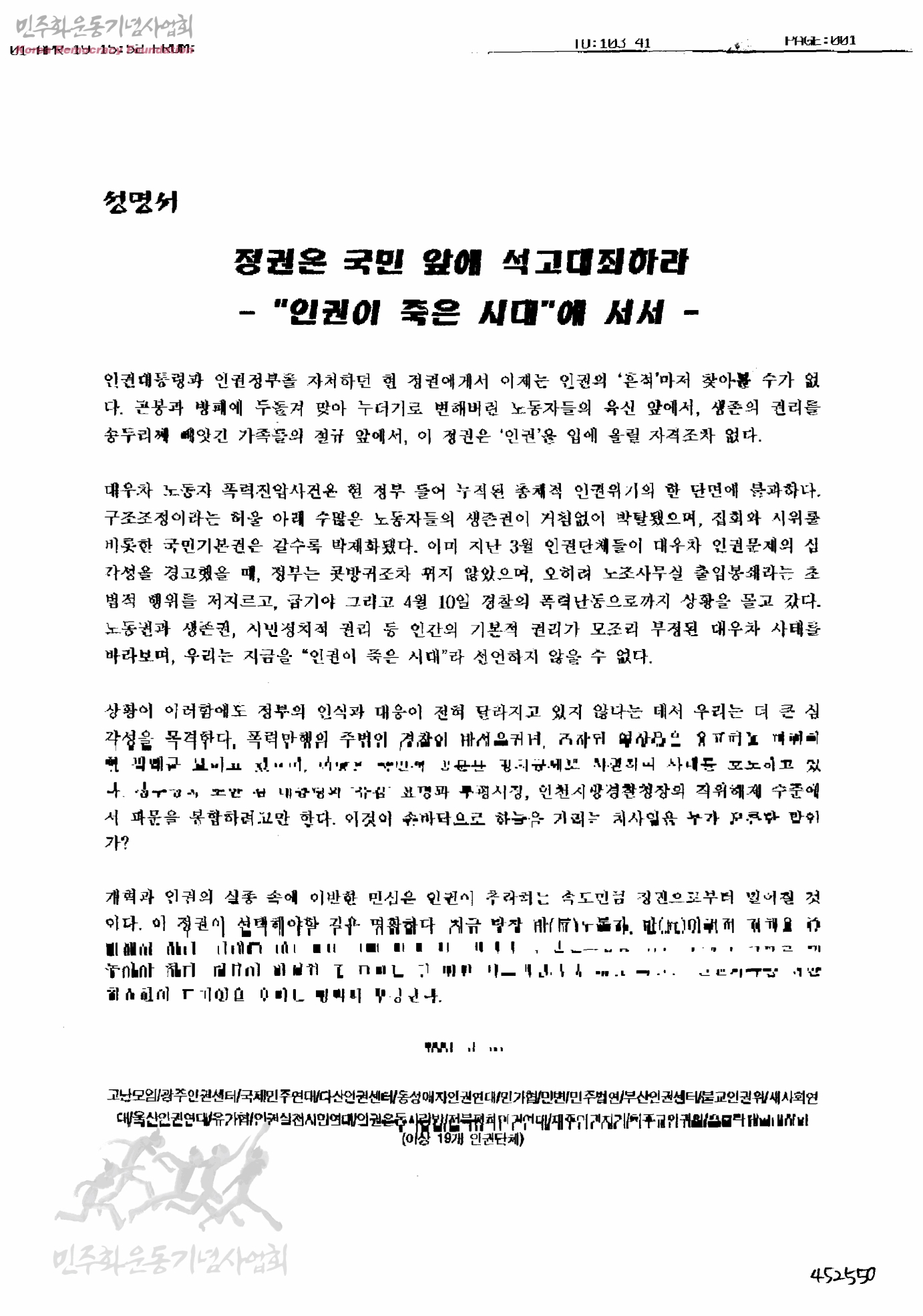 성명서 정권은 국민 앞에 석고대죄하라-"인권이 죽은 시대"에 서서