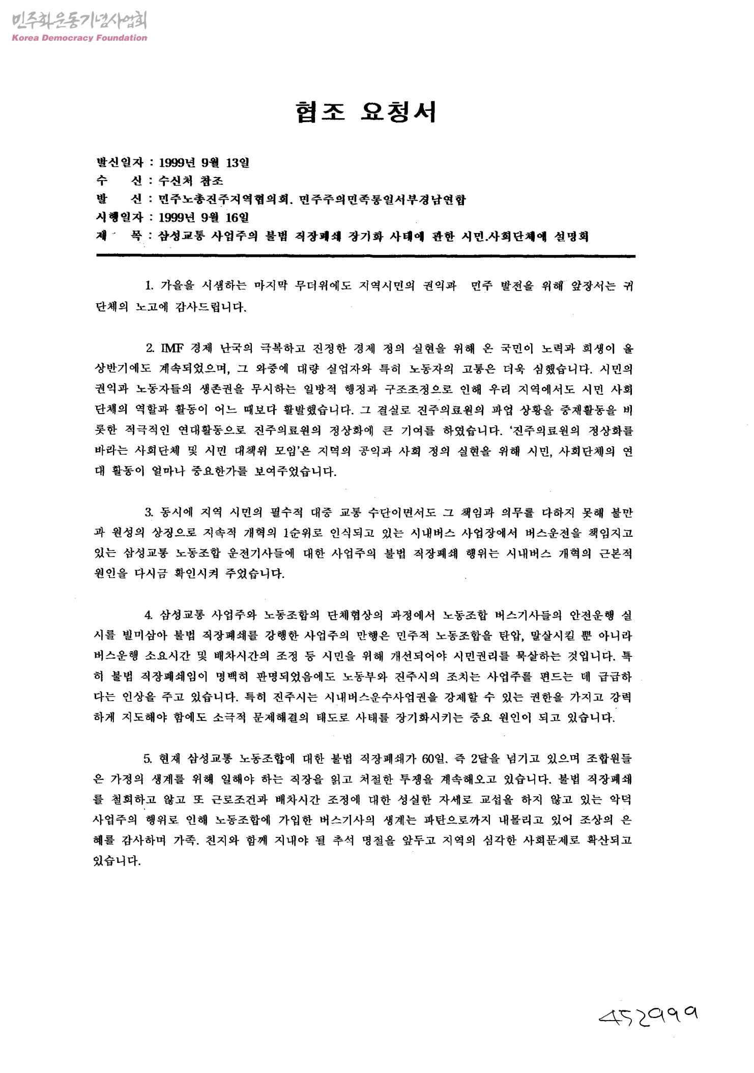 협조요청서-삼성교통 사업주의 불법 직장폐쇄 장기화 사태에 관한 시민,사회단체에 설명회[발신:민주노총진주지역협의회, 민주주의민족통일서부경남연합]