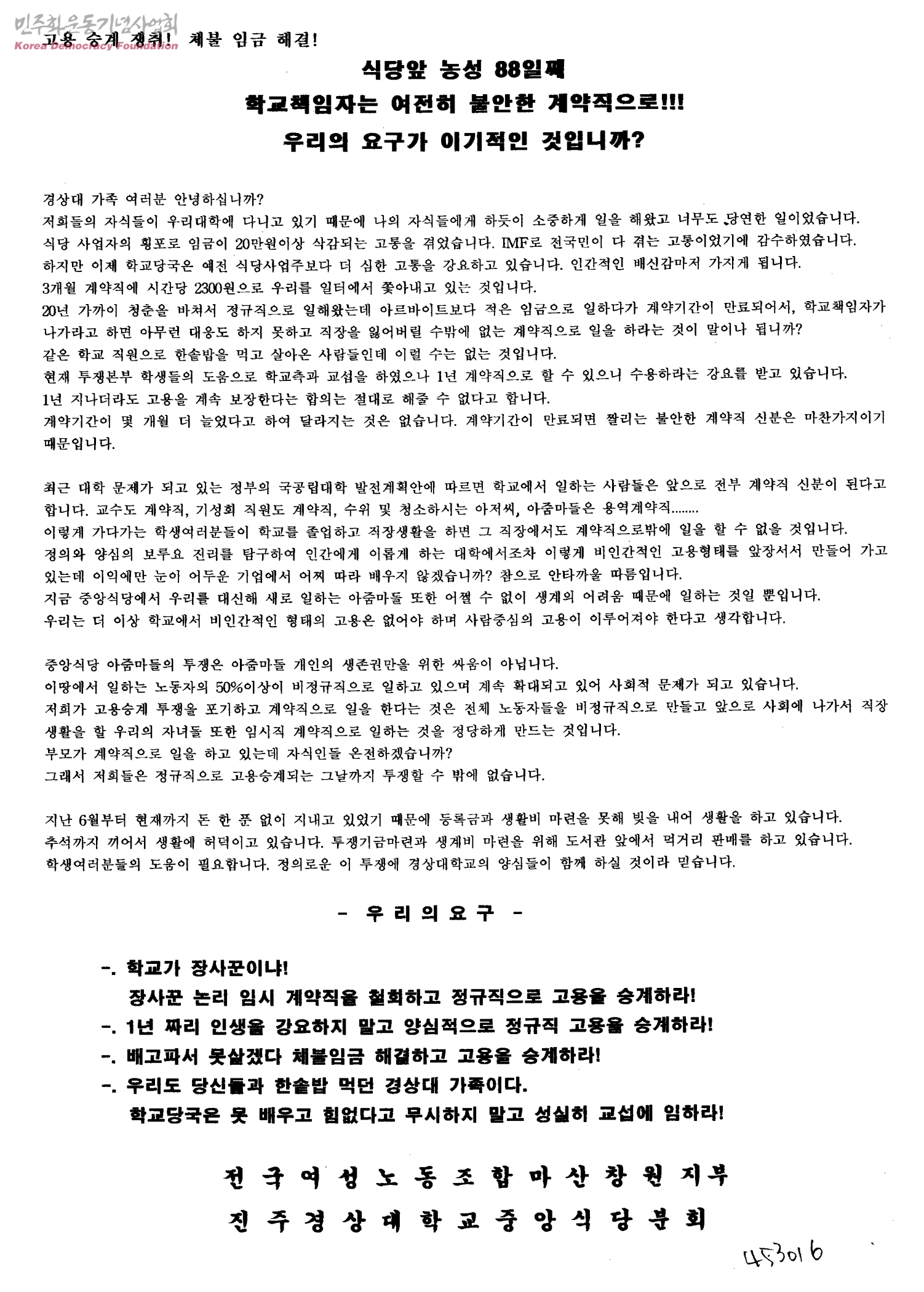 - 전국여성노동조합 마산창원지부, 진주경상대학교 중앙식당분회