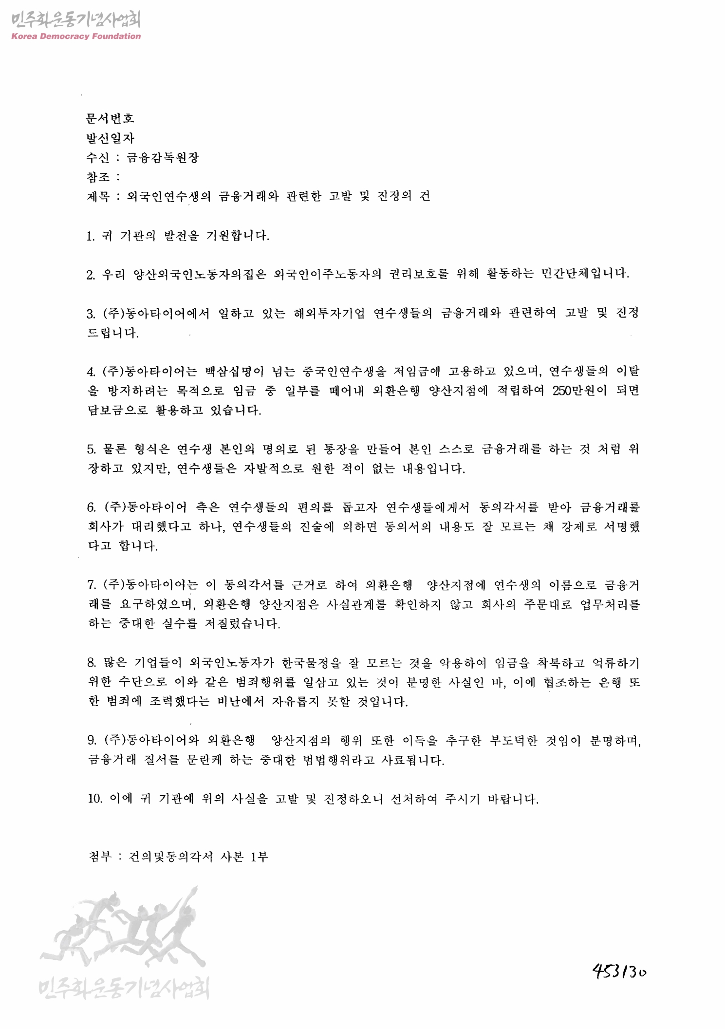 외국인연수생의 금융거래와 관련한 고발 및 진정의 건[수신:금융감독원, 발신:양산외국인노동자의집]