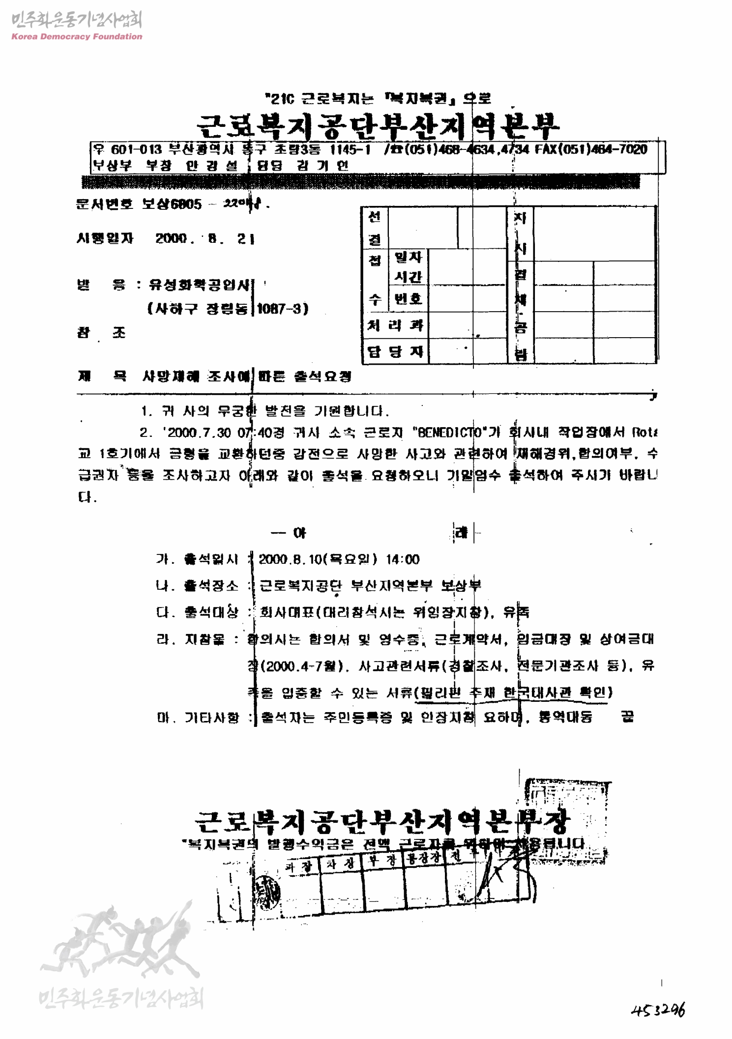 사망재해 조사에 따른 출석요청[수신:유성화혹공업사, 발신:근로복지공단 부산지역본부]