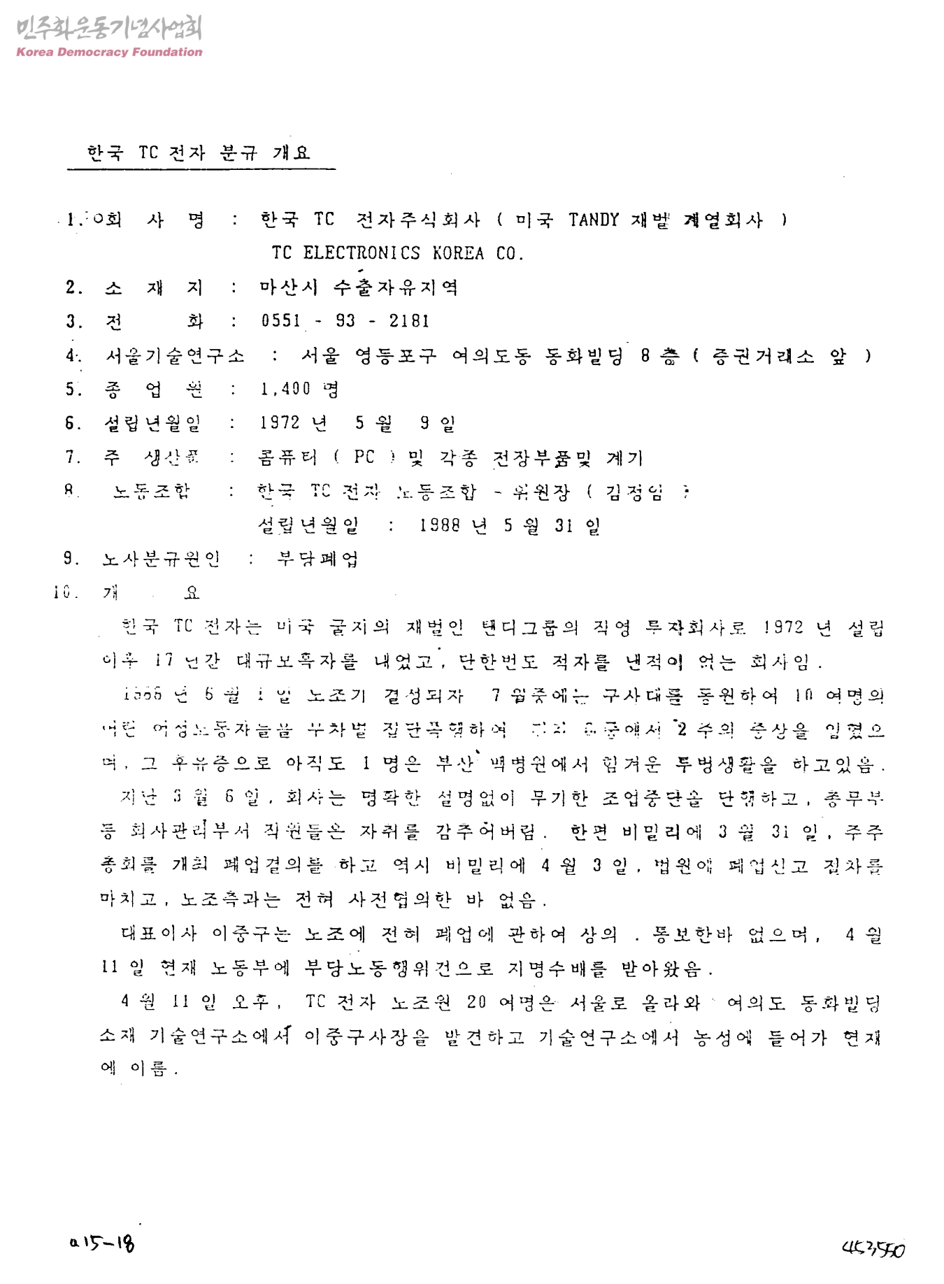 - "성명서-한국 T.C 전자 폐업사태의 조속한 해결을 촉구한다" 포함