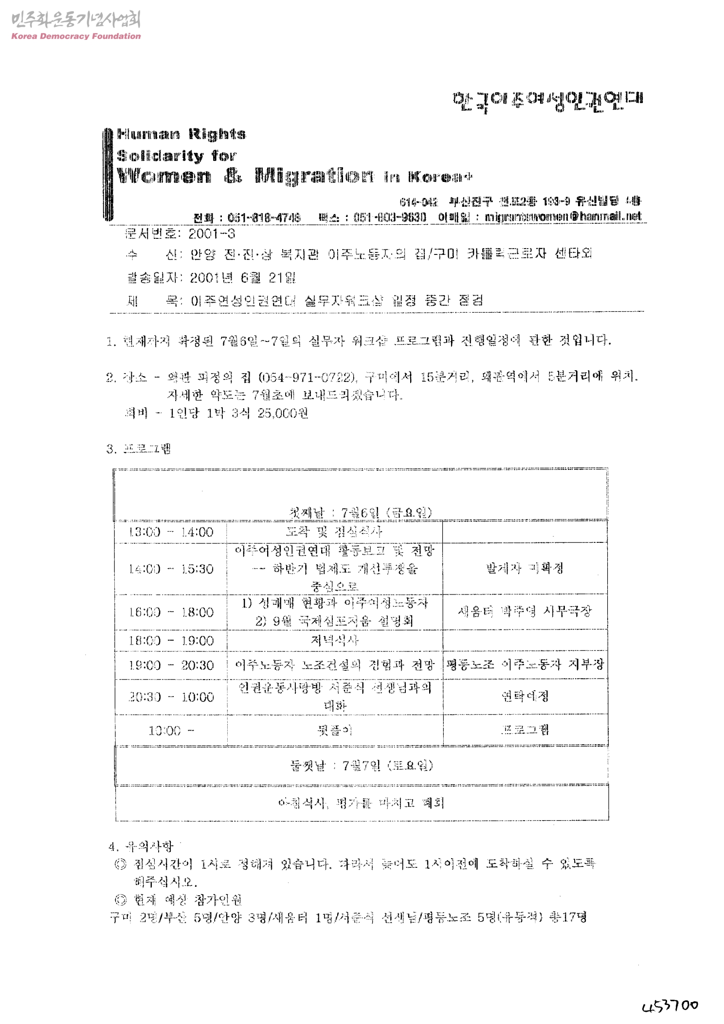 이주연성인권연대 실무자워크샵 일정 중간 점검[수신:안양 전.진.상 복지관 이주노동자의 집/구미 카톨릭근로자 센타외]