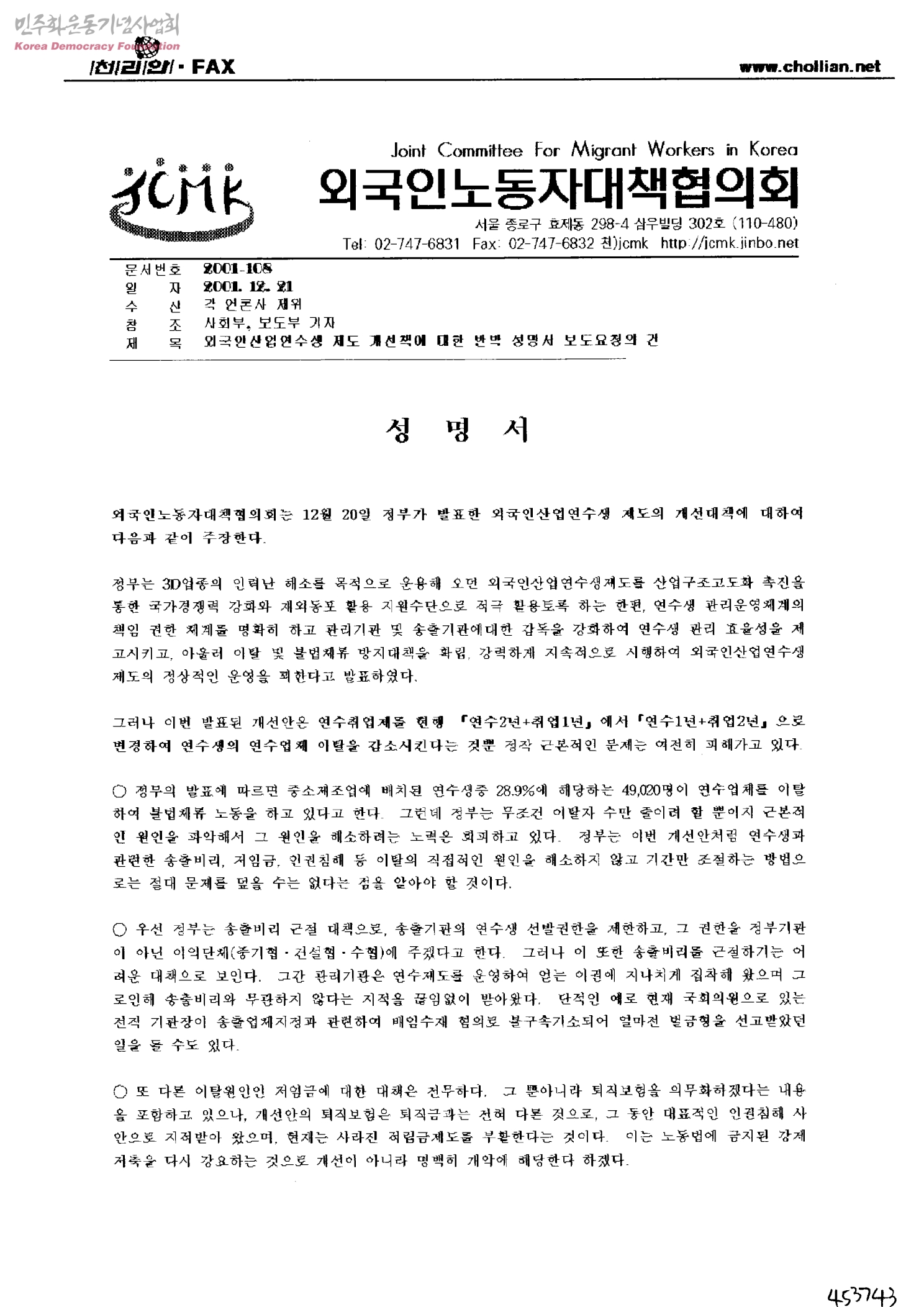 외국인산업연수생 제도 개선책에 대한 반박 성명서 보도요청의 건[수신:각 언론사 제위]