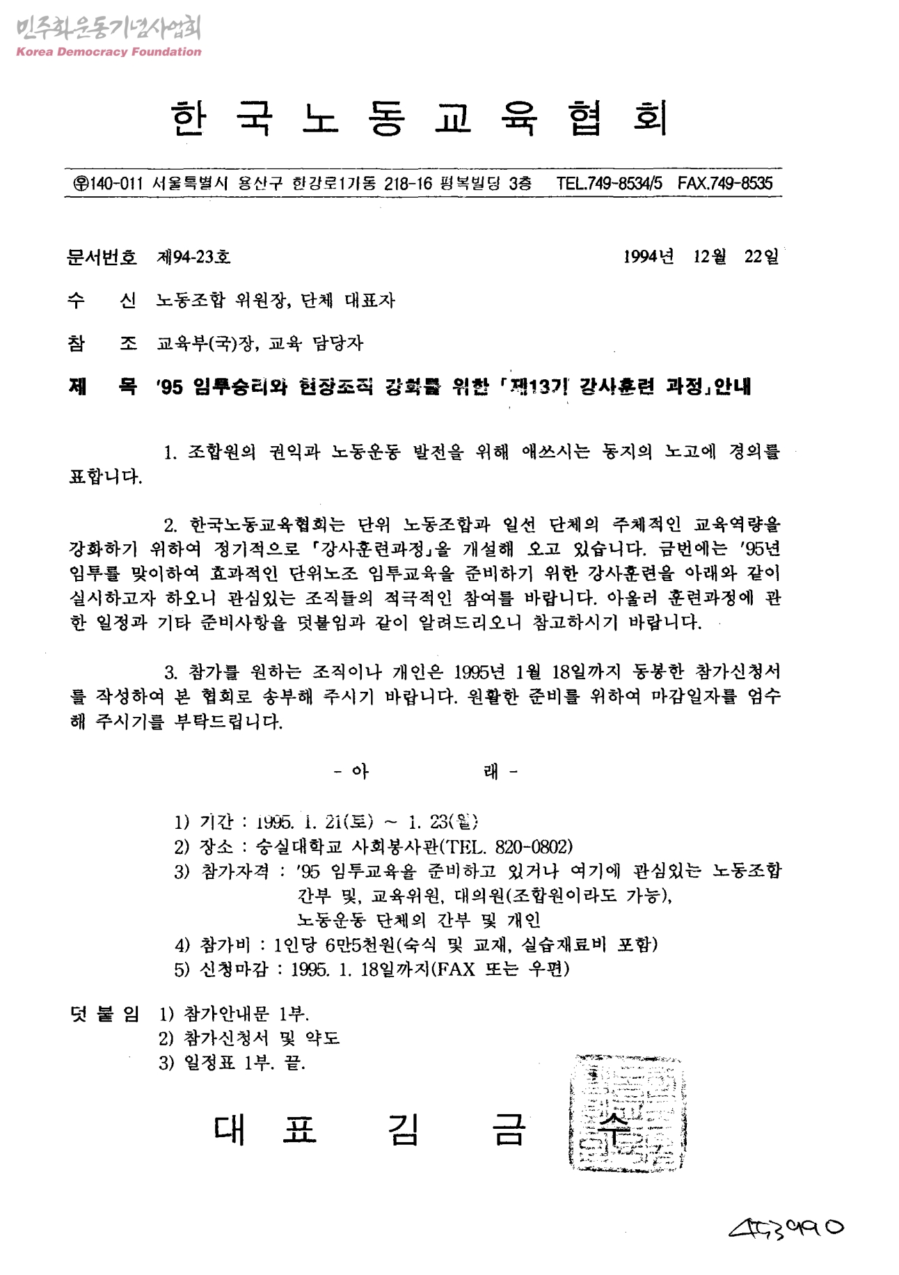 '95임투승리와 현장조직 강화를 위한 제13기 강사훈련 과정 안내[수신:노동조합위원장, 단체대표자]