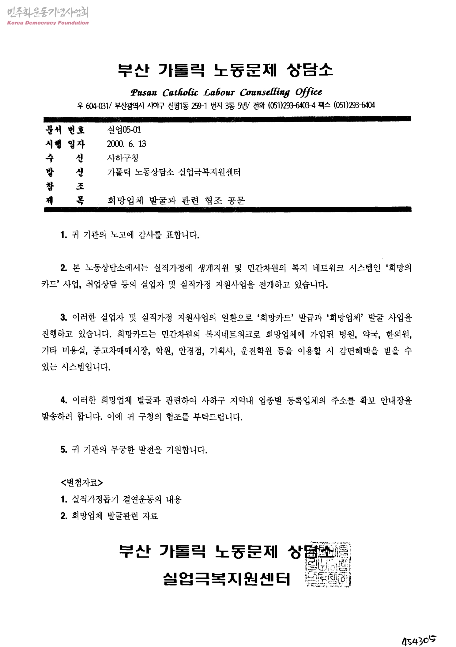 희망업체 발굴과 관련 협조 공문[수신:사하구청,발신:부산가톨릭노동문제상담소(Pusan Catholic Labour Counselling Office)실업극복지원센터]