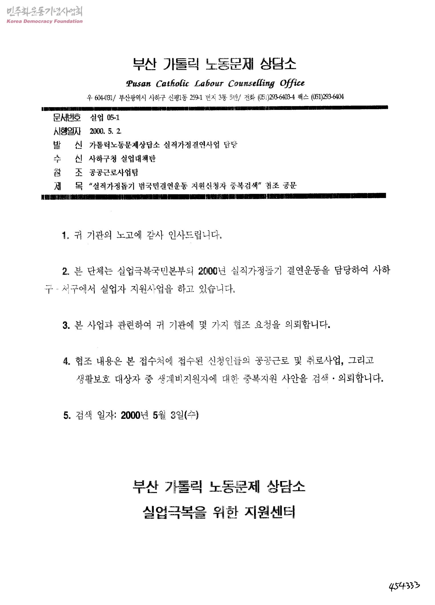 "실직가정돕기 범국민결연운동 지원신청자 중복검색" 협조 공문[수신:사하구청 실업대책반, 발신:가톨릭노동문제상담소 실직가정결연사업담당]