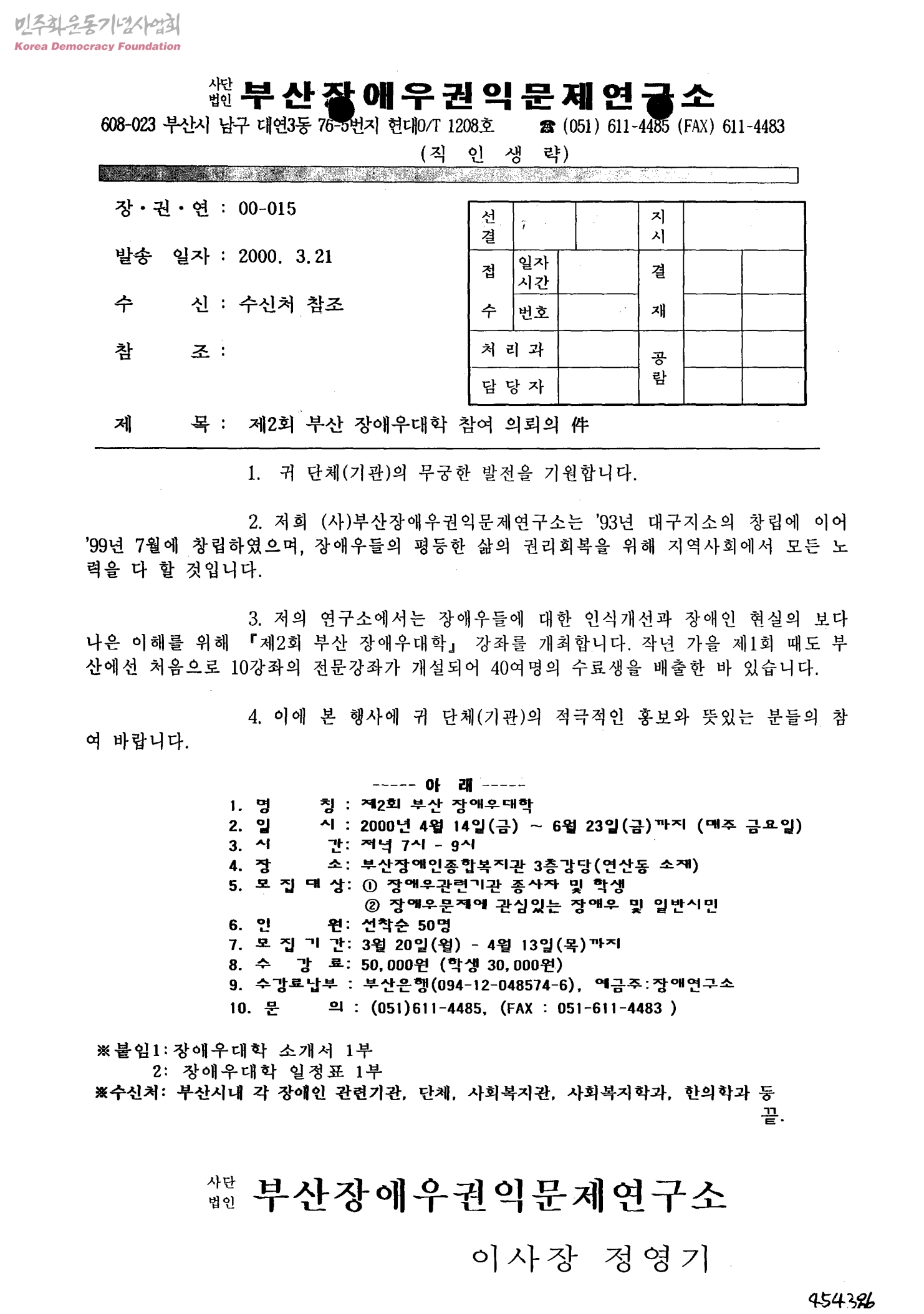 제2회 부산 장애우대학 참여 의뢰의 件[수신:부산시내 각 장애인 관련기관, 단체, 사회복지관, 사회복지학과, 한의학과 등]