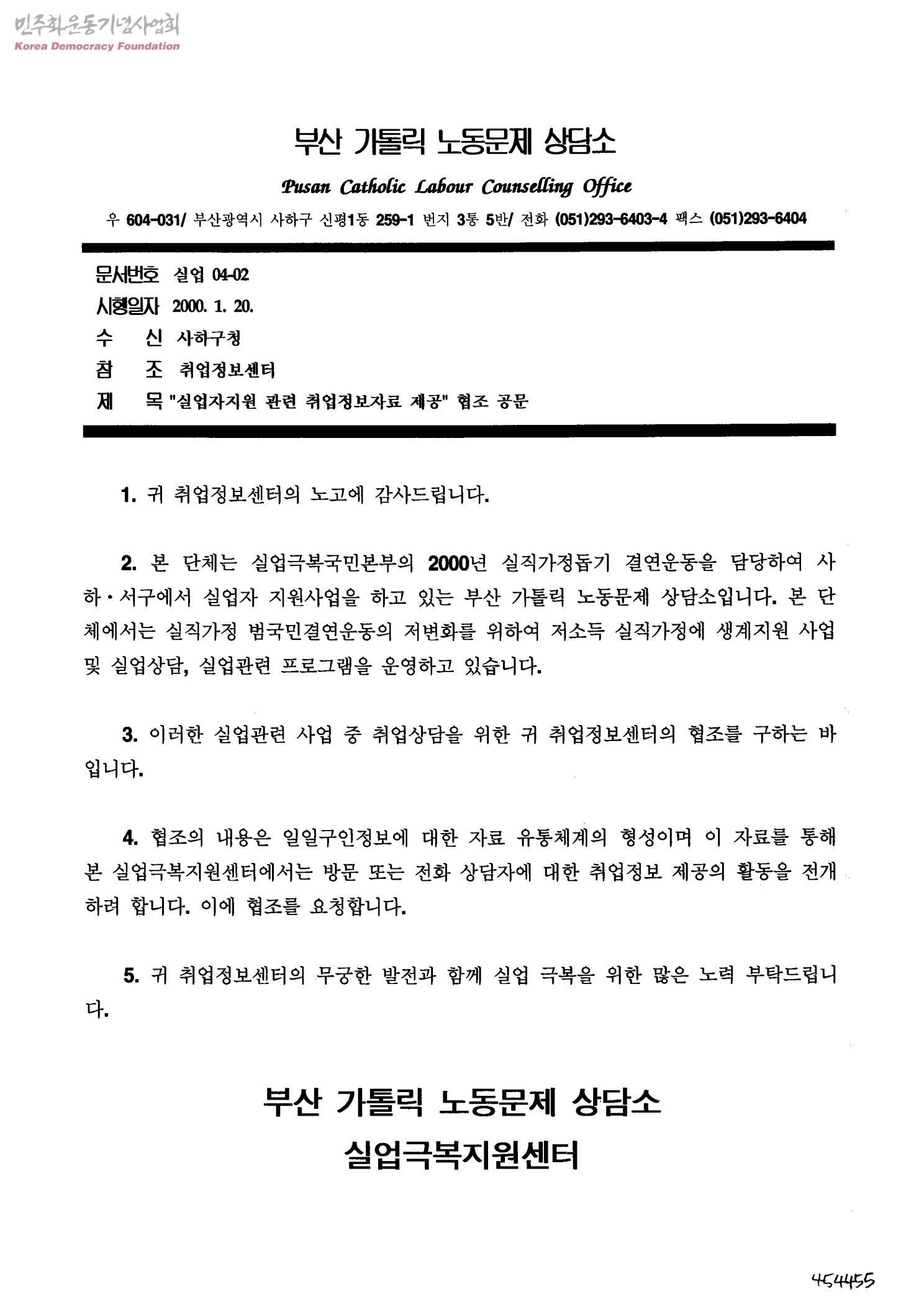 "실업자지원 관련 취업정보자료 제공" 협조 공문[수신:사하구청]