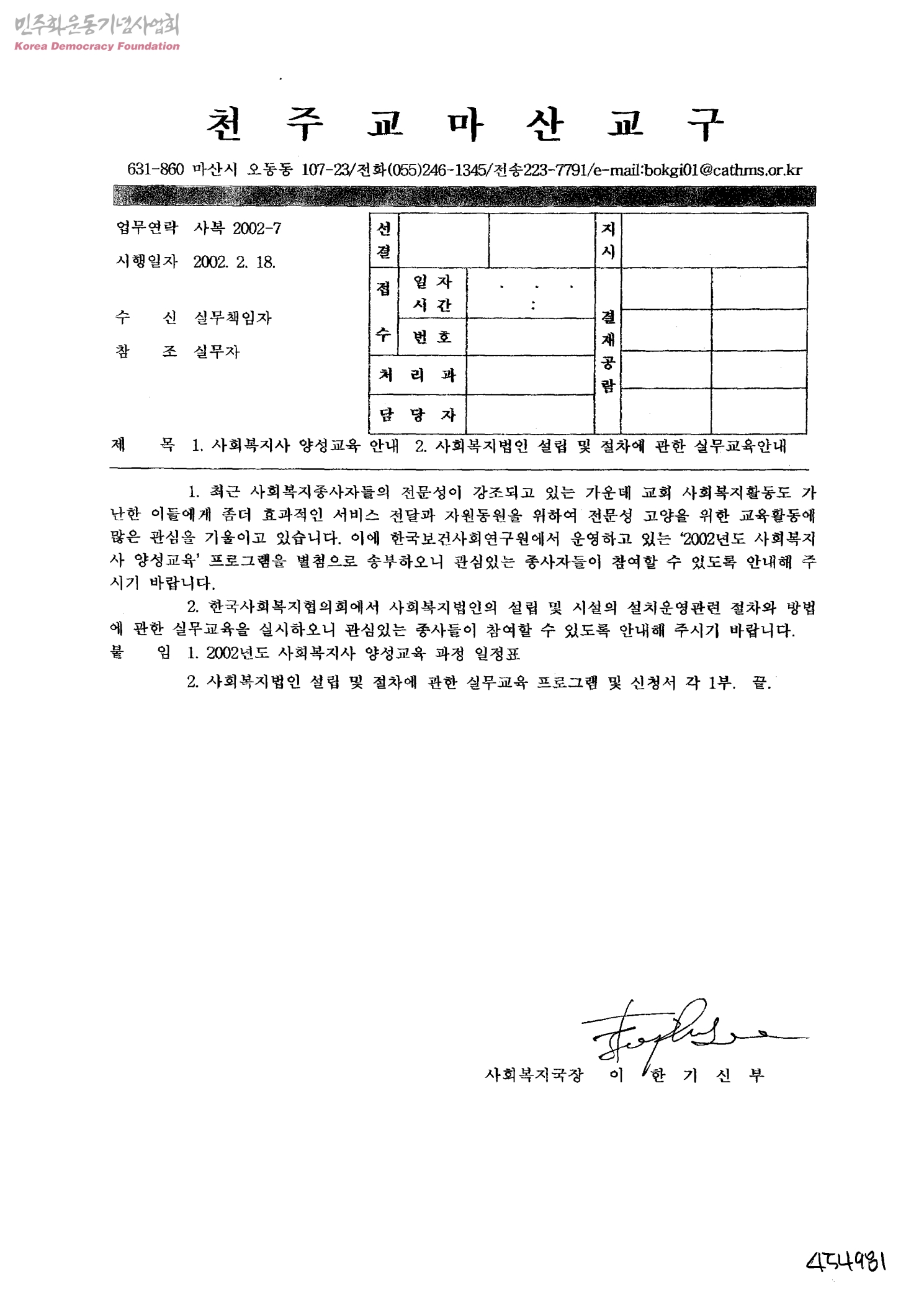 - 첨부문서: 1.2002년도 사회복지사 양성교육 과정별 주요일정(한국보건사회연구원 운영) 2.2002년도 사회복지법인 설립 및 시설설치운영 절차와 방법 실무교육 프로그램 안내,한국사회복지협의회