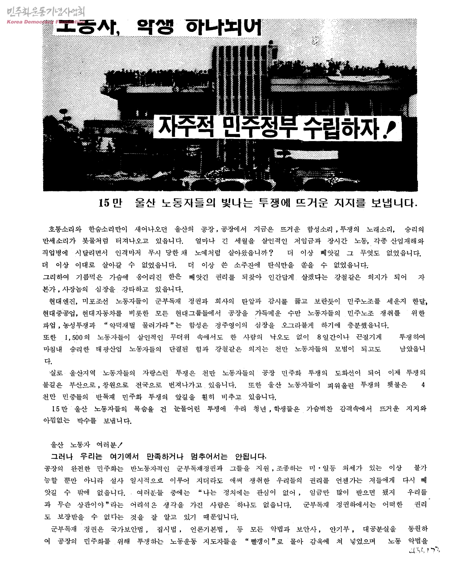 노동자, 학생 하나되어 자주적 민주정부 수립하자!-15만 울산 노동자들의 빛나는 투쟁에 뜨거운 지지를 보냅니다.