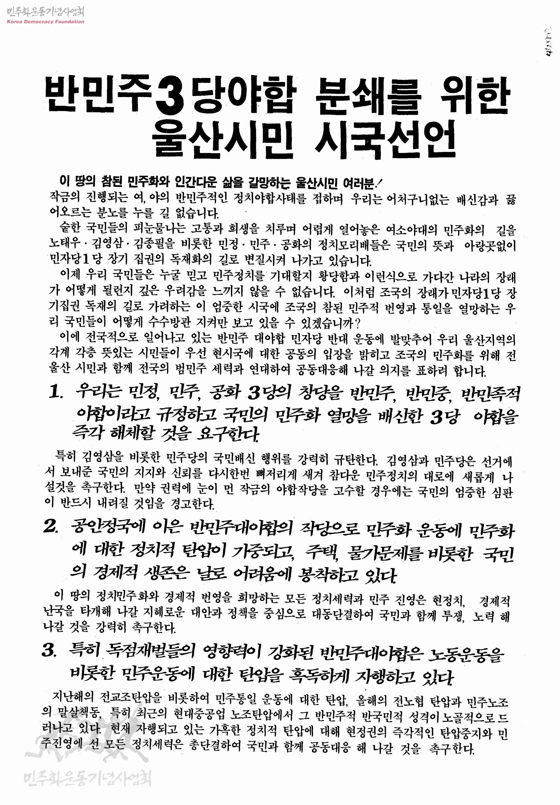 반민주3당야합 분쇄를 위한 울산시민 시국선언