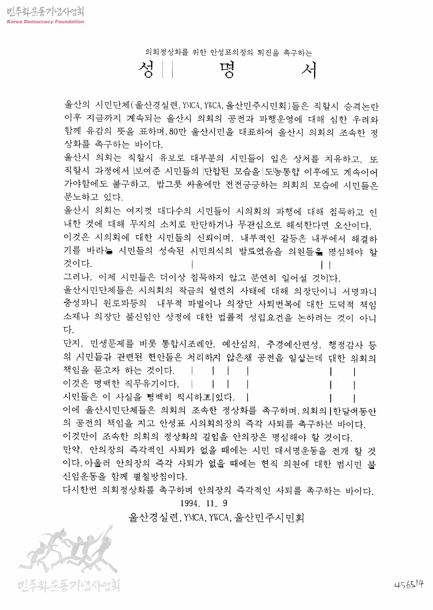 의회정상화를 위한 안성표의장의 퇴진을 촉구하는 성명서