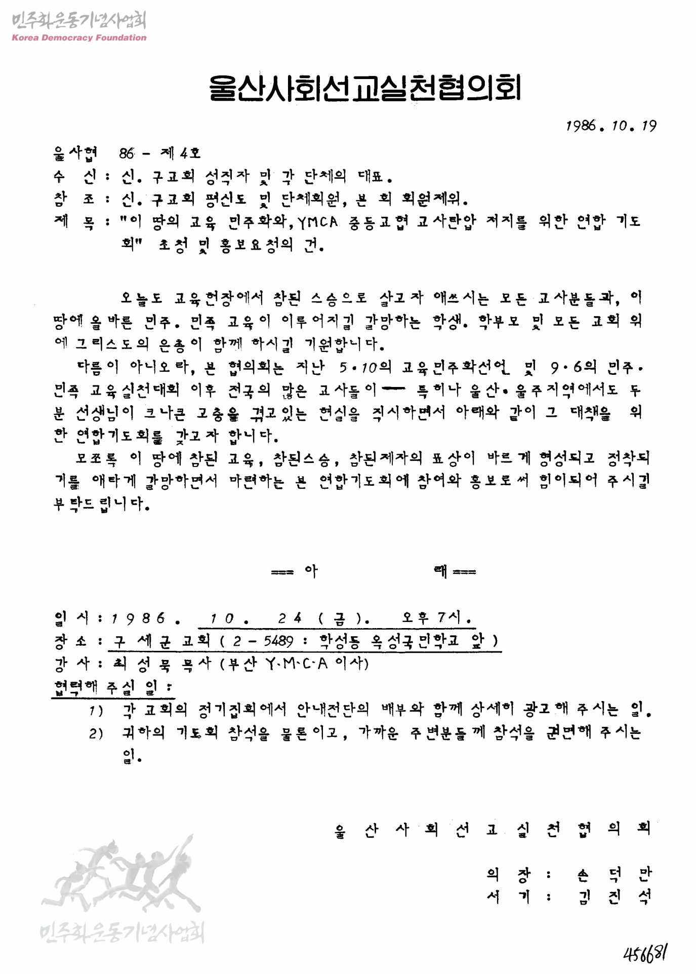 "이 땅의 교육 민주화와, YMCA 중등교협 교사탄압 저지를 위한 연합 기도회" 초청 및 홍보요청의 건[수신:신.구교회 성직자 및 각 단체의 대표]