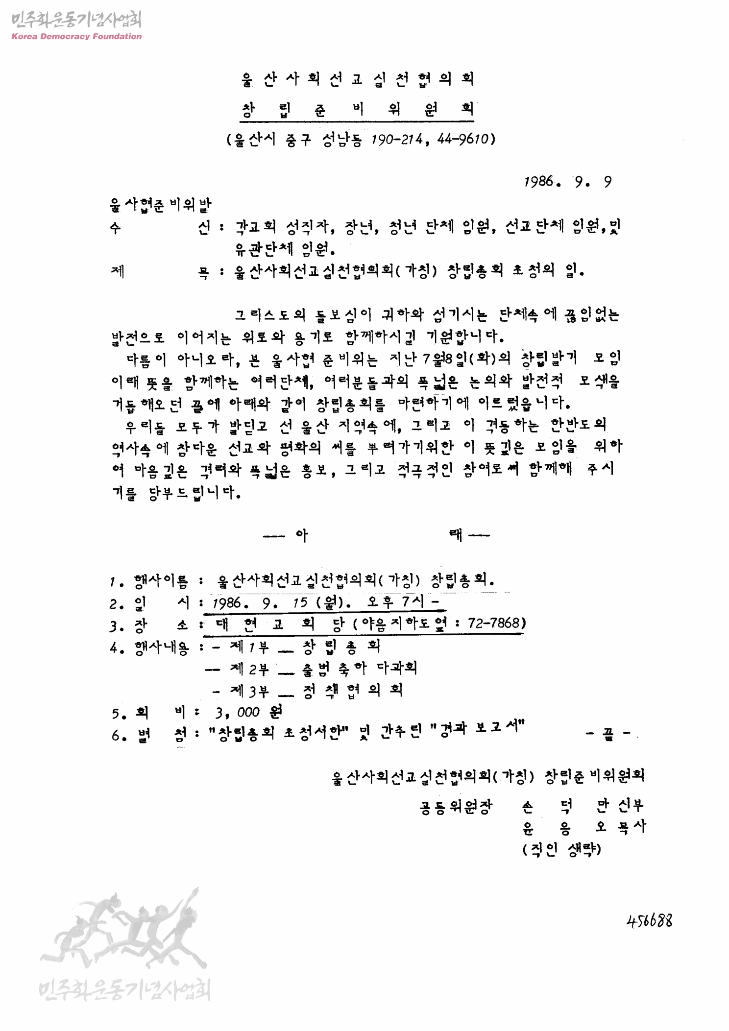 울산사회선교실천협의회(가칭) 창립총회 초청의 일[수신:각교회 성직자, 장년, 청년단체 임원, 선교단체 임원, 및 유관단체 임원]