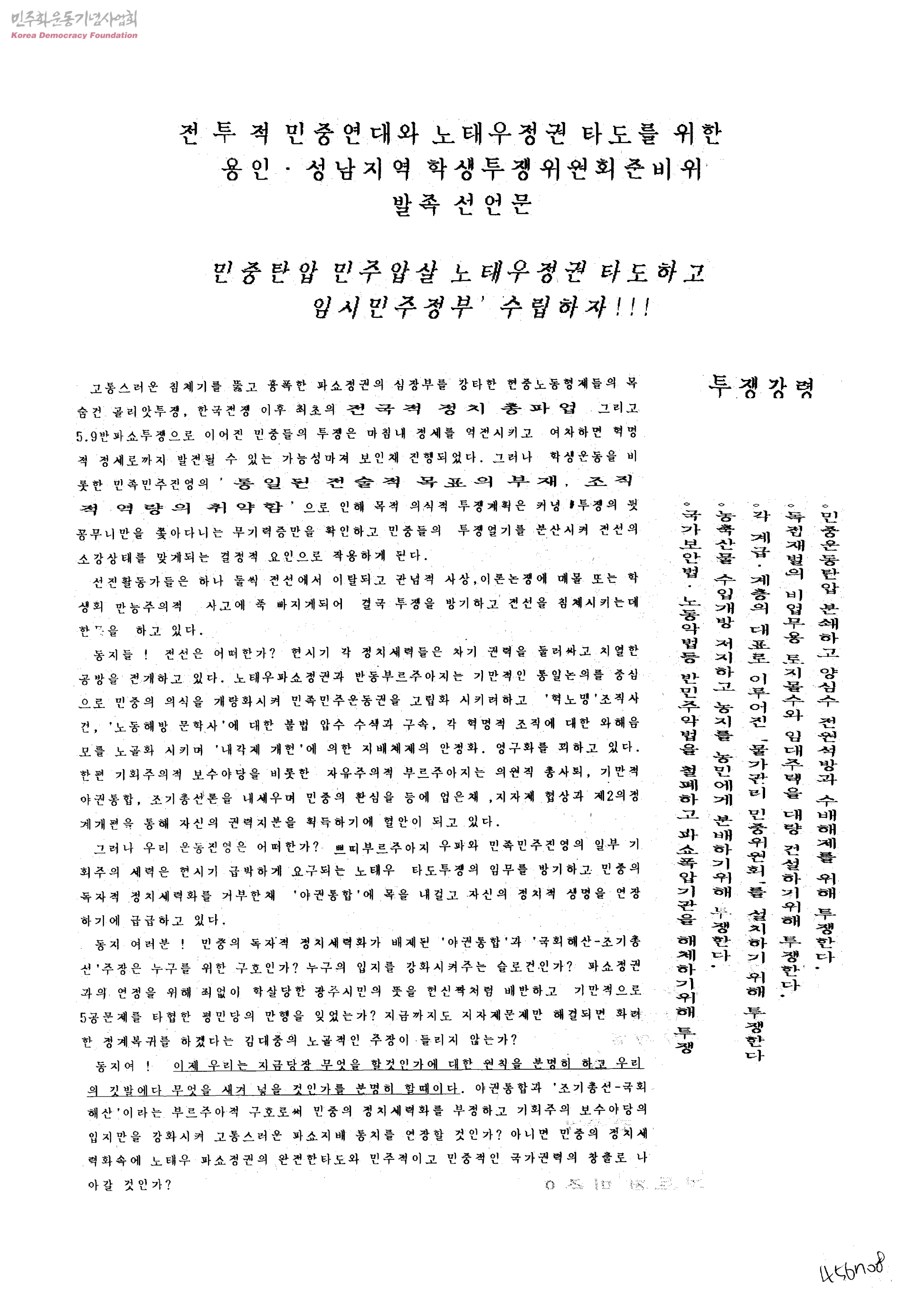 전투적 민중연대와 노태우정권 타도를 위한 용인.성남지역 학생투쟁위원회준비위 발족 선언문-민중탄압 민주압살 노태우정권 타도하고 '임시민주정부'수립하자!!!