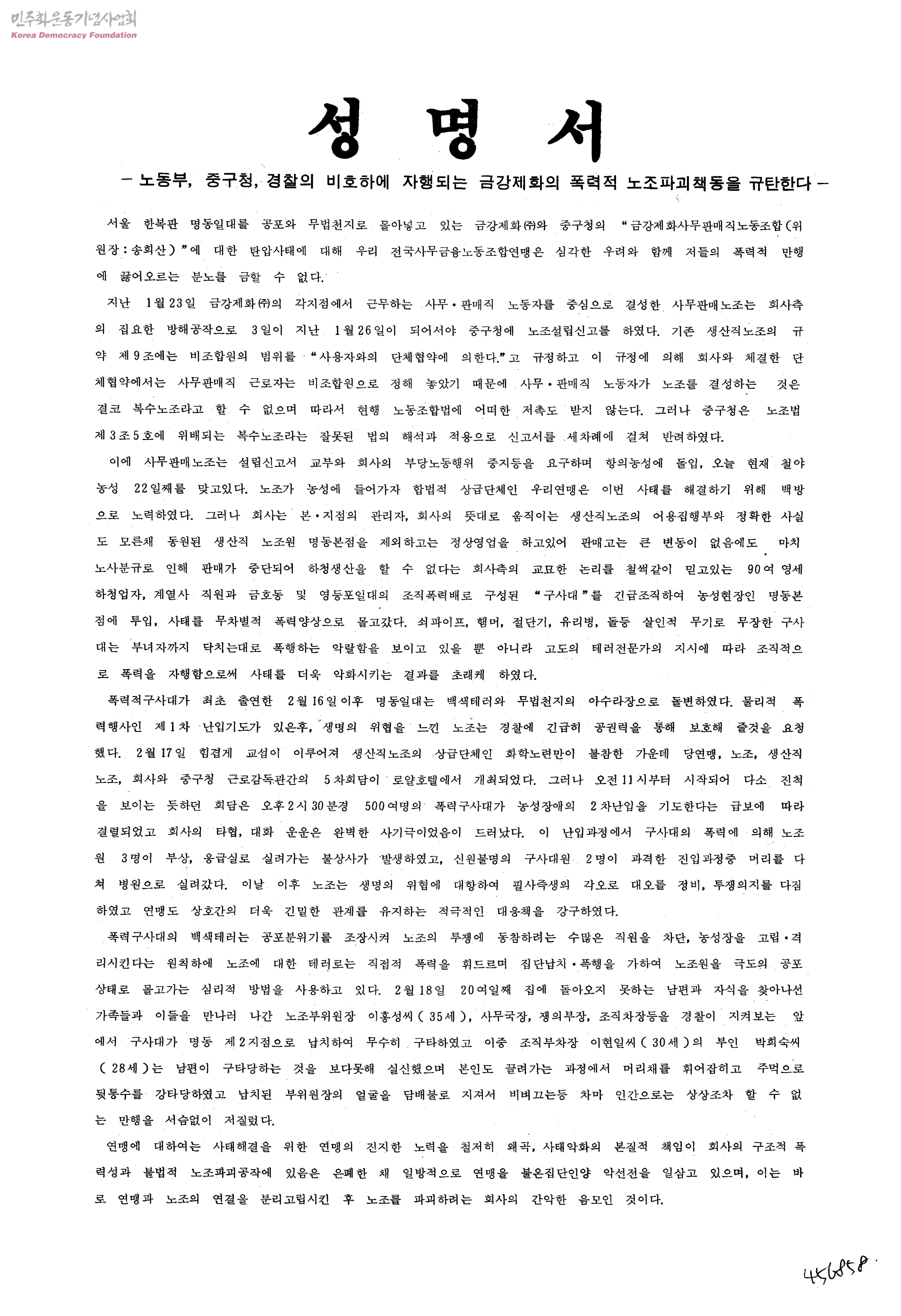 성명서-노동부,중구청,경찰의 비호하에 자행하는 금강제화의 폭력적 노조파괴책동을 규탄한다-
