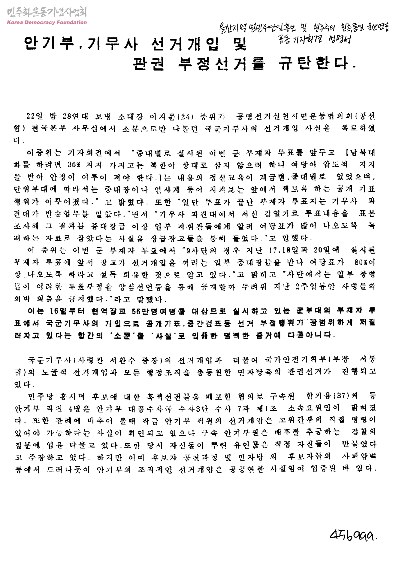 울산지역 범민주단일후보 및 민주주의 민족통일 공동기자회견 성명서-안기부, 기무사 선거개입 및 관권 부정선거를 규탄한다