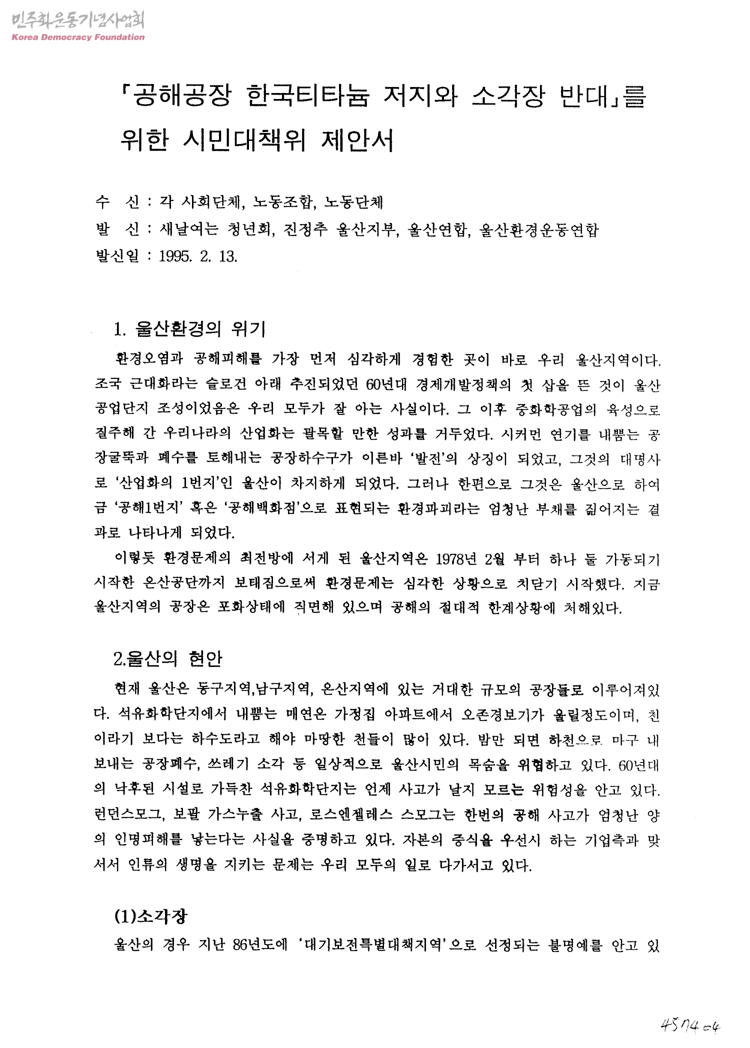 「공해공장 한국티타늄 저지와 소각장 반대」를 위한 시민대책위 제안서[수신:각 사회단체, 노동조합, 노동단체, 발신:새날여는 청년회, 진보정당추진위원회 울산지부, 울산연합, 울산환경운동연합]
