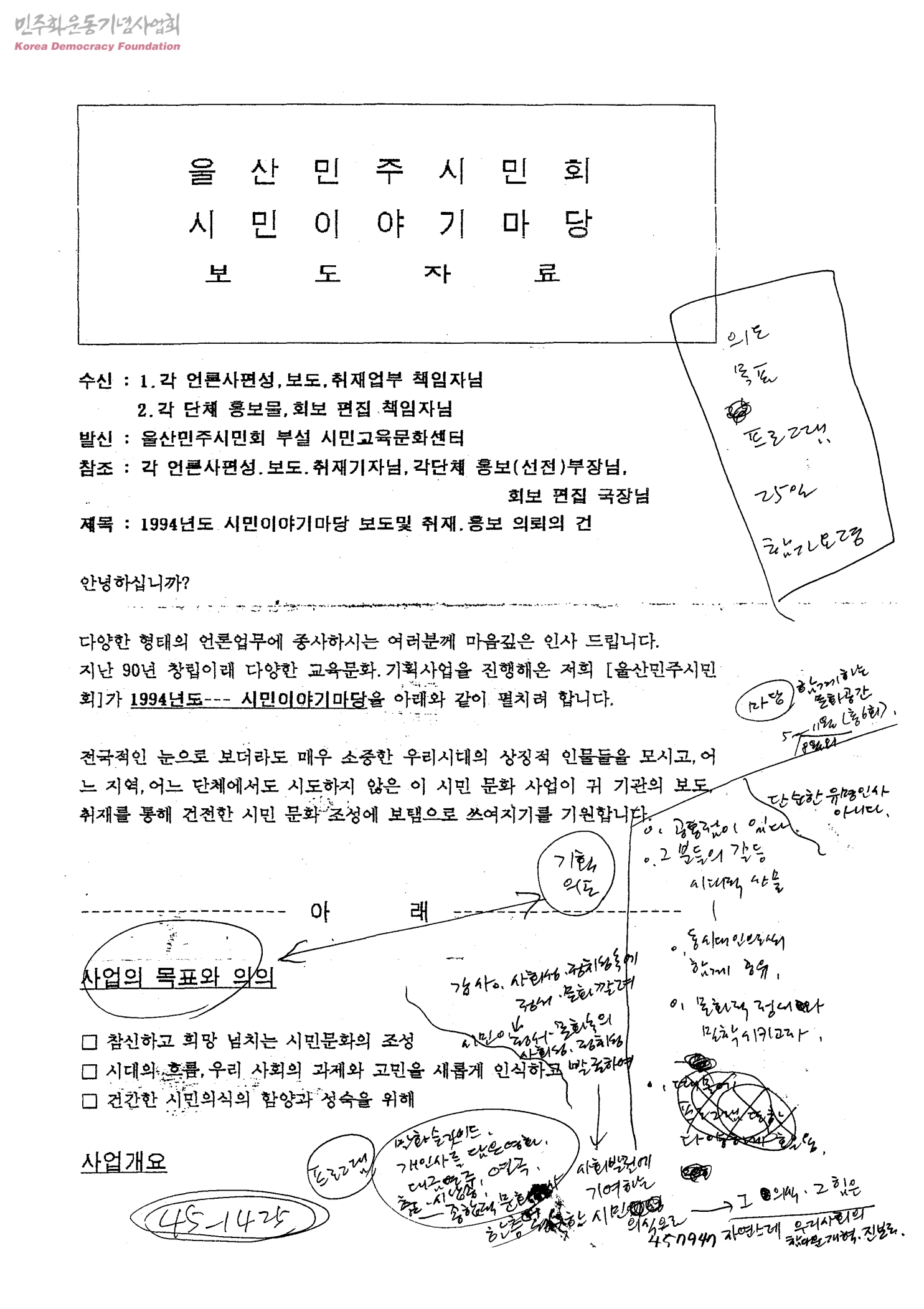 1994년도 시민이야기마당 보도및 취재,홍보 의뢰의 건[수신:각 언론사편성,보도,취재업무 책임자님, 각 단체 홍보물,회보 편집부 책임자님, 발신:울산민주시민회 부설 시민교육문화센터]