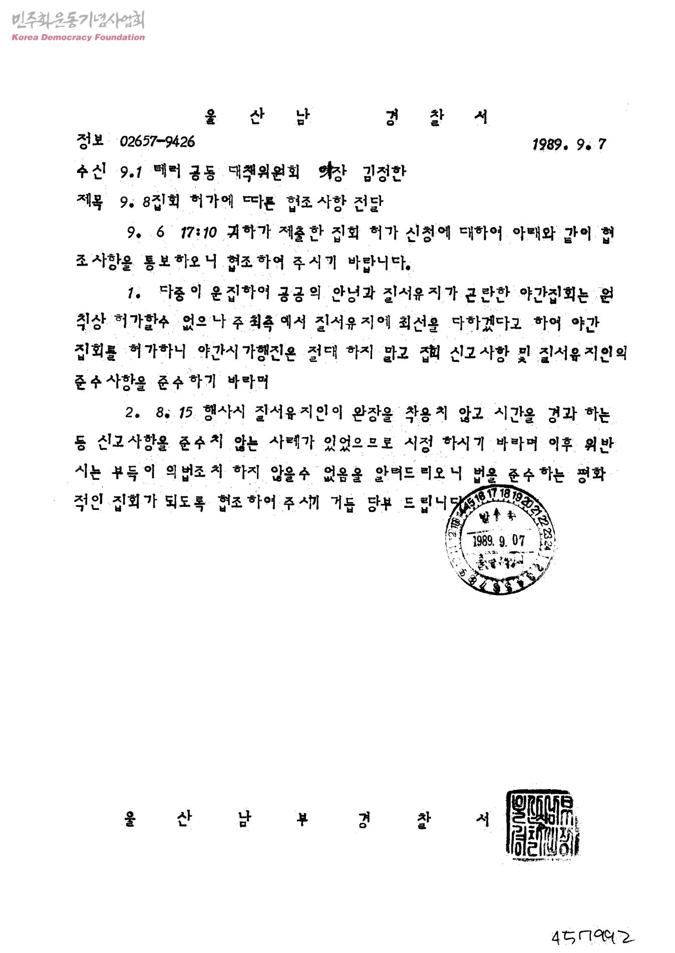 9.8집회 허가에 따른 협조사항 전달