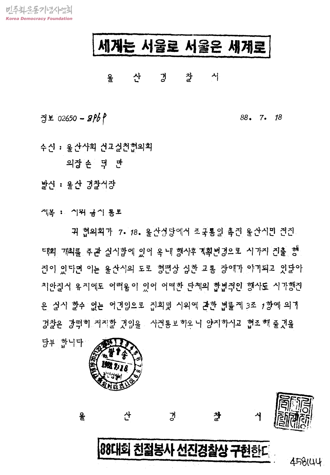 시위 금지 통보[수신:울산사회선교실천협의회 의장 손덕만, 발신:울산경찰서장]