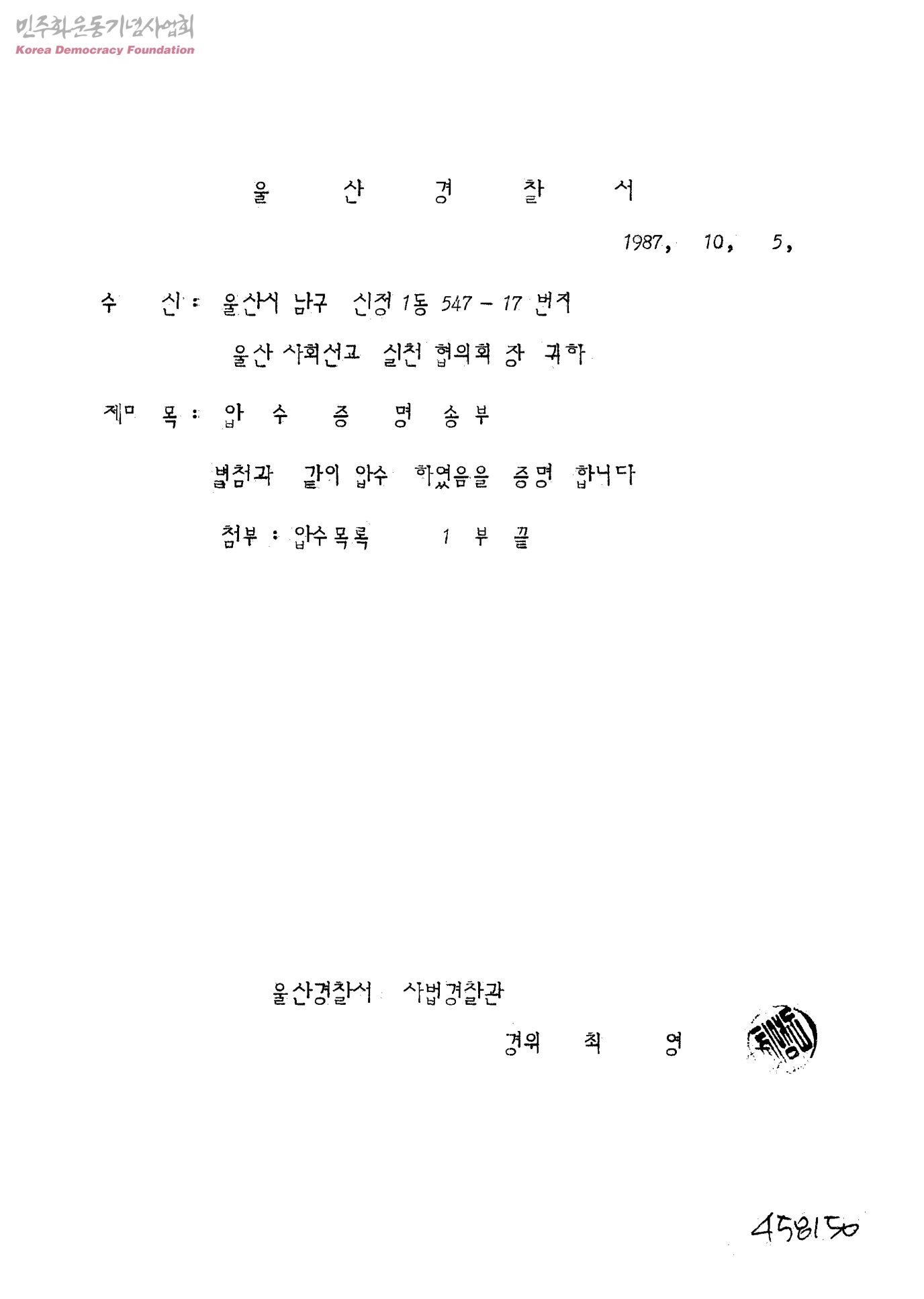 압수증명 송부[울산사회선교실천협의회장]