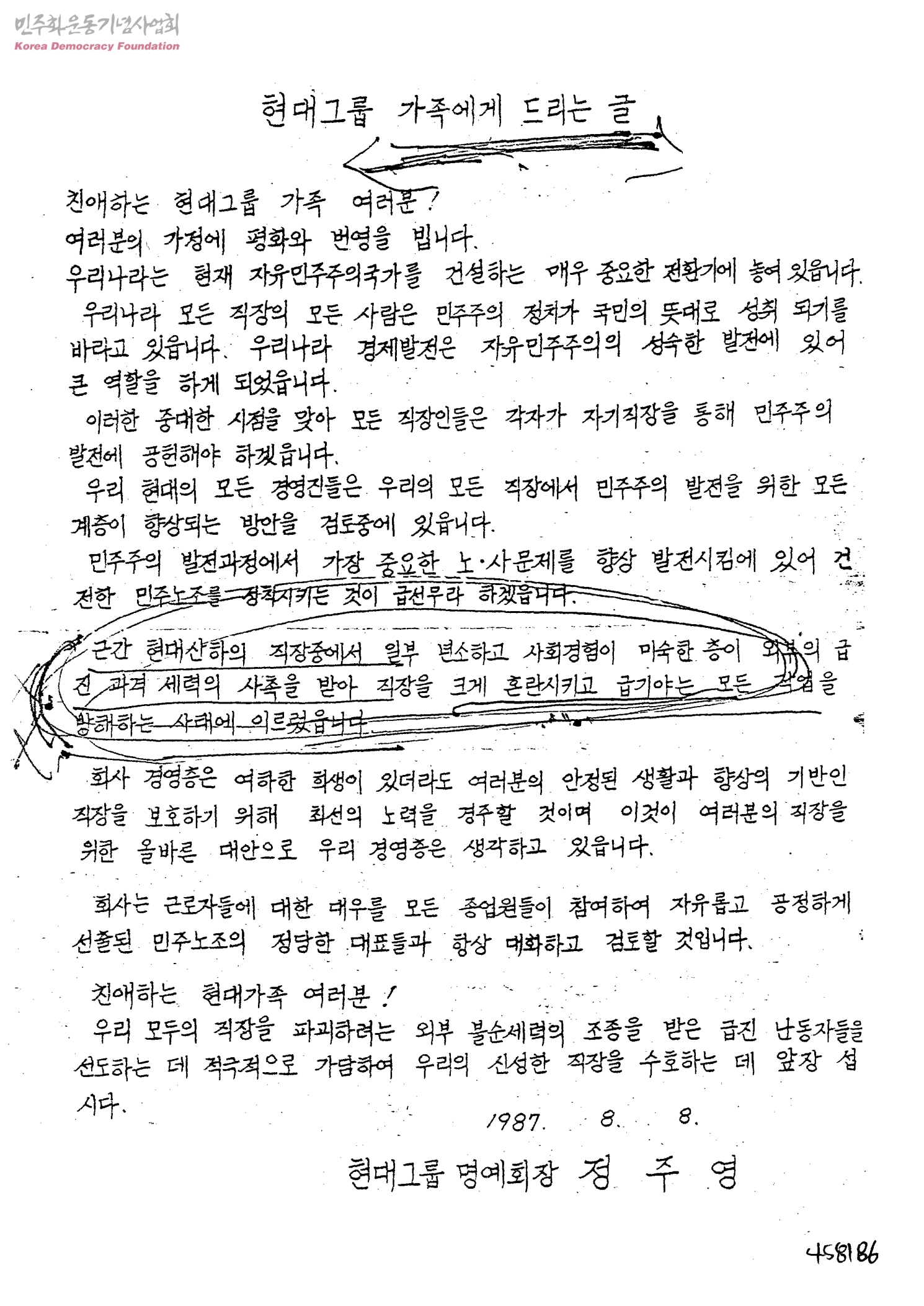 [현대그룹 명예회장 정주영씨가 현대그룹 가족들에게 보내는 경영측에서 노사를 위하여 힘쓰고 있다는 내용의 편지]