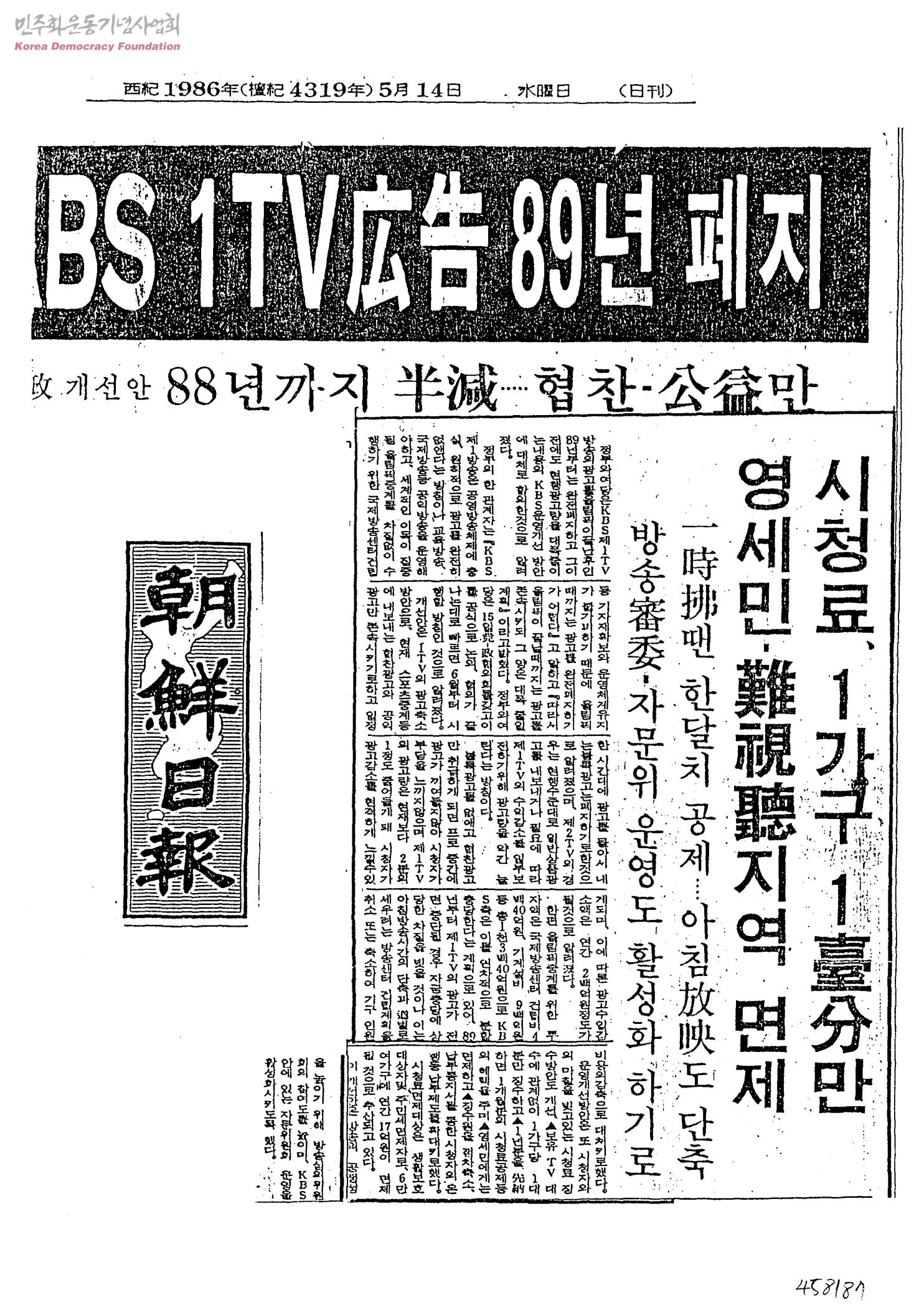 [신문스크랩]KBS 1TV 廣告 89년 폐지