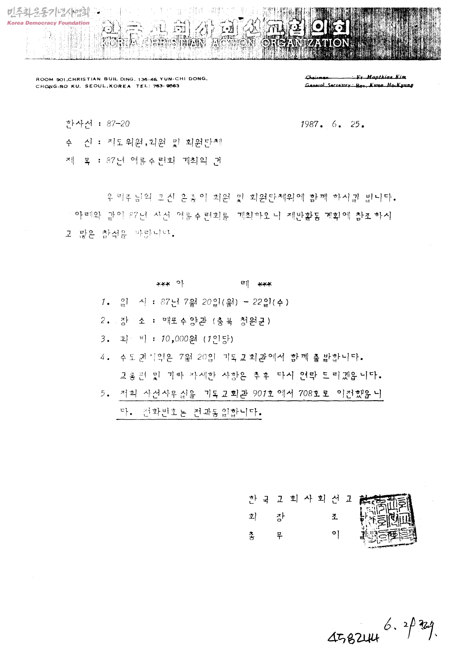 87년 여름수련회 개최의 건[수신:지도위원, 회원 및 회원단체]