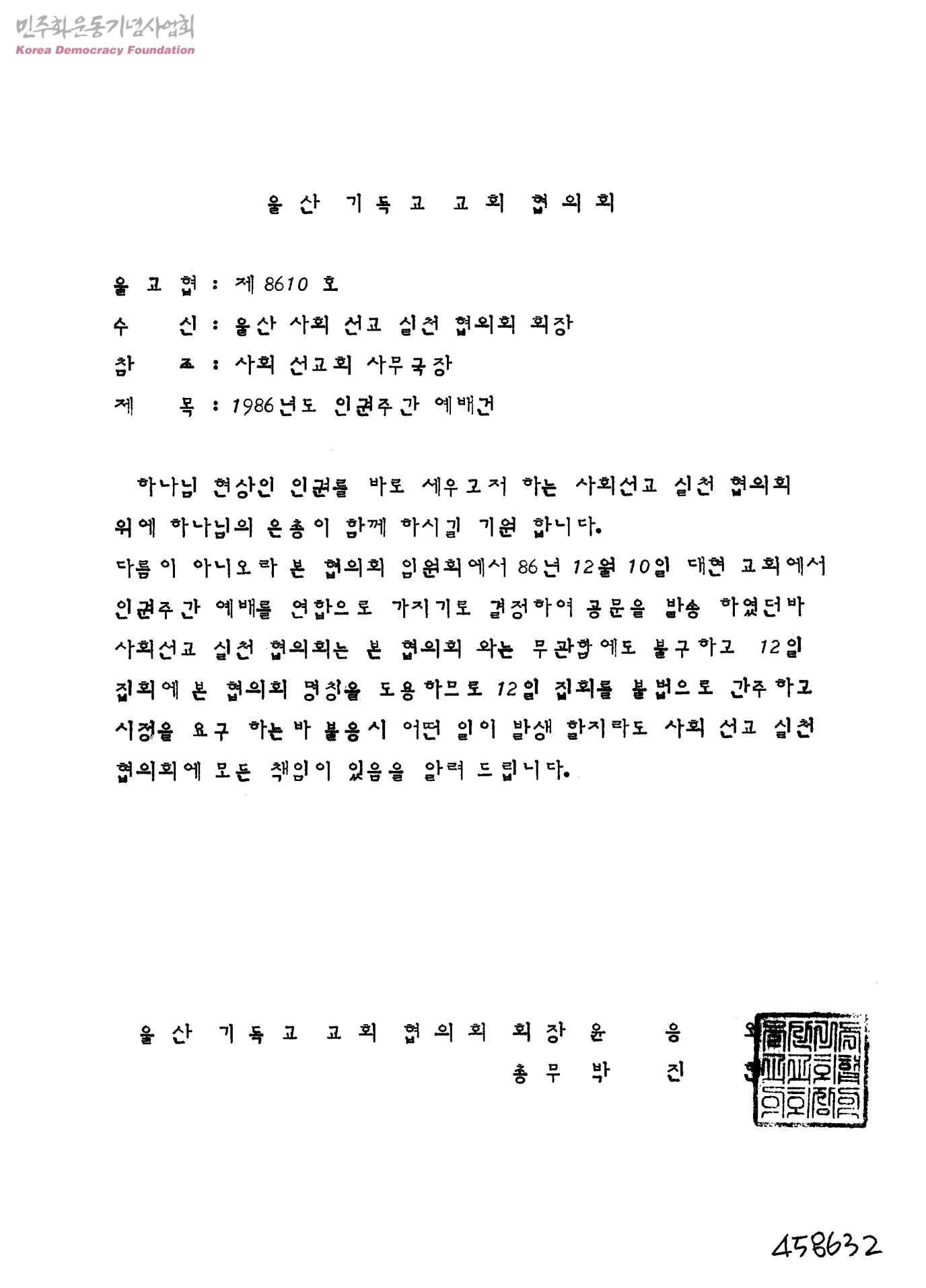 1986년도 인권주간 예배건[수신:울산사회선교실천협의회회장]