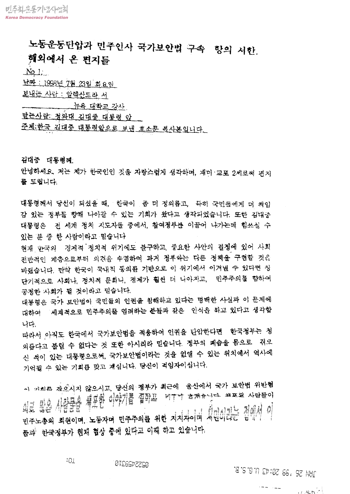 노동운동탄압과 민주인사 국가보안법 구속 항의서한. 해외에서 온 편지들 No1.[수신:청화대 김대중 대통령 앞, 발신: 알렉산드라 서 뉴욕 대학교 강사]