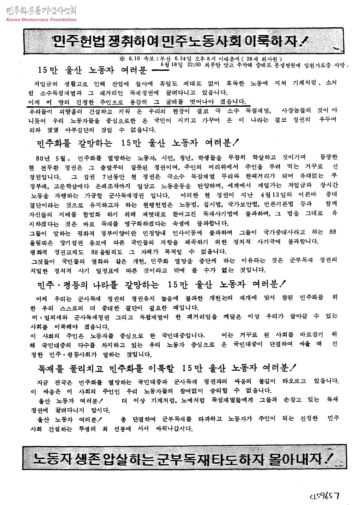 민주헌법 쟁취하여 민주노동사회 이룩하자!