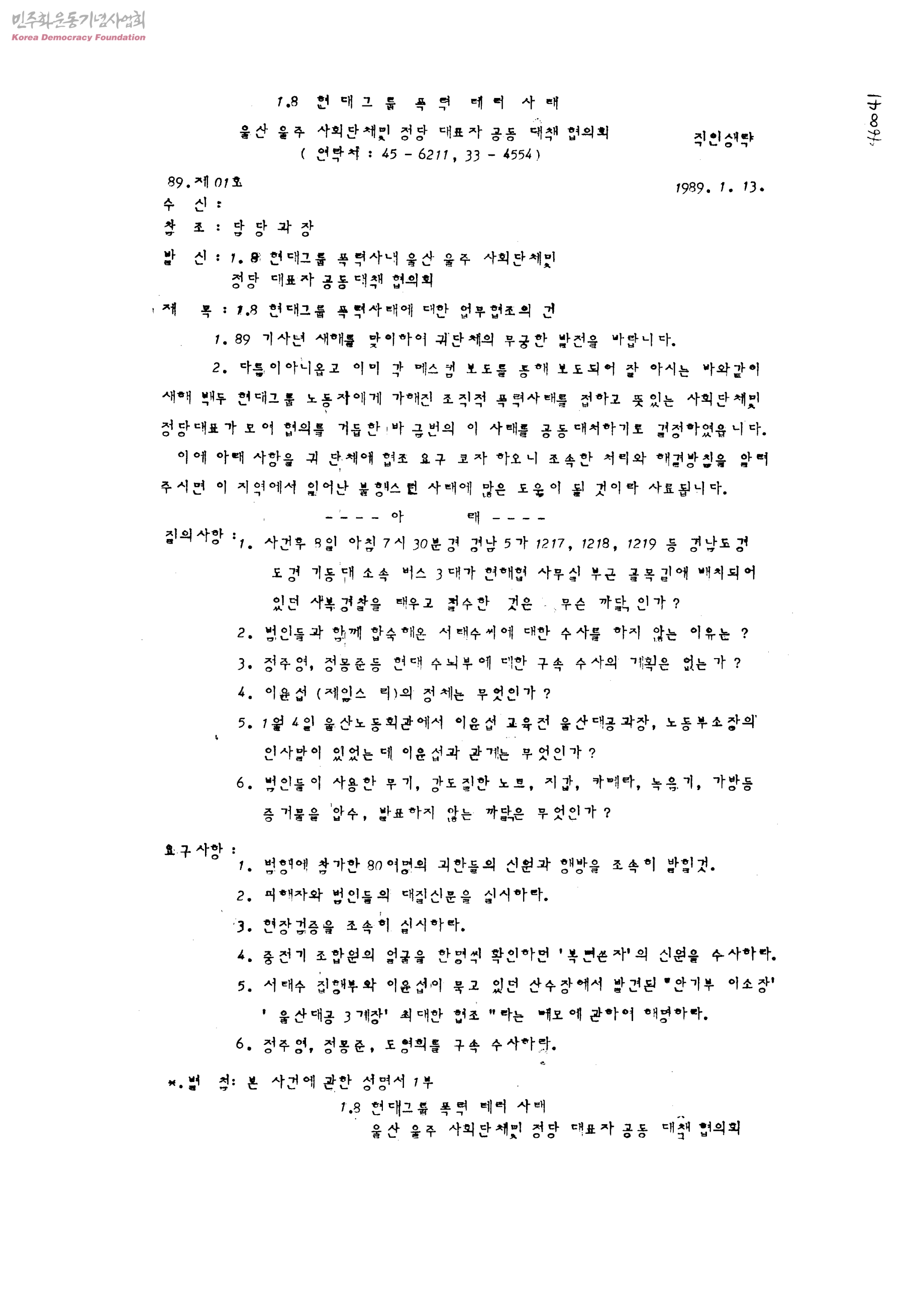 - 첨부문서:성명서-현대그룹 테러 만행과 수사발표에 대한 우리의 입장,1989-01-13,1.8현대그룹폭력테러사태울산울주사회단체및정당대표자공동대책협의회