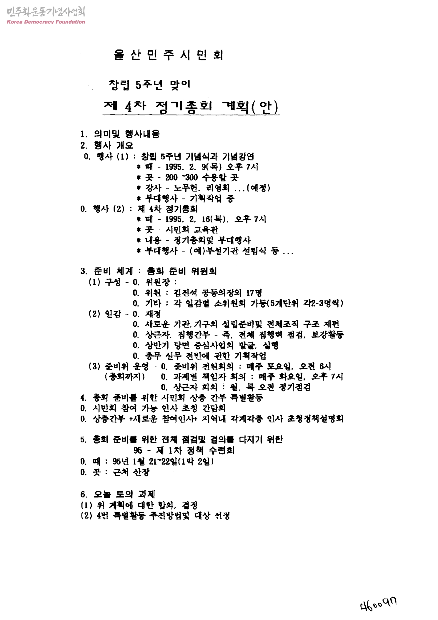 울산민주시민회 창립5주년맞이 제 4차 정기총회 계획(안)