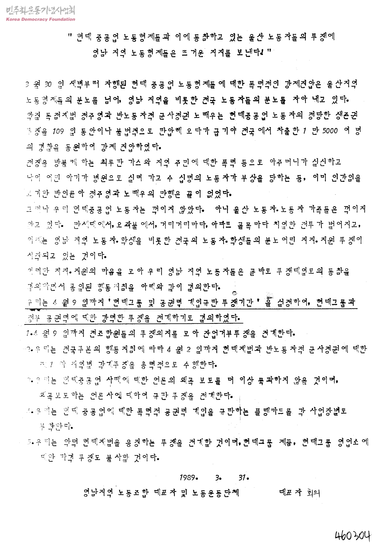 현대 중공업 노동형제들과 이에 동참하고 있는 울산 노동자들의 투쟁에 영남 지역 노동형제들은 뜨거운 지지르 보낸다!