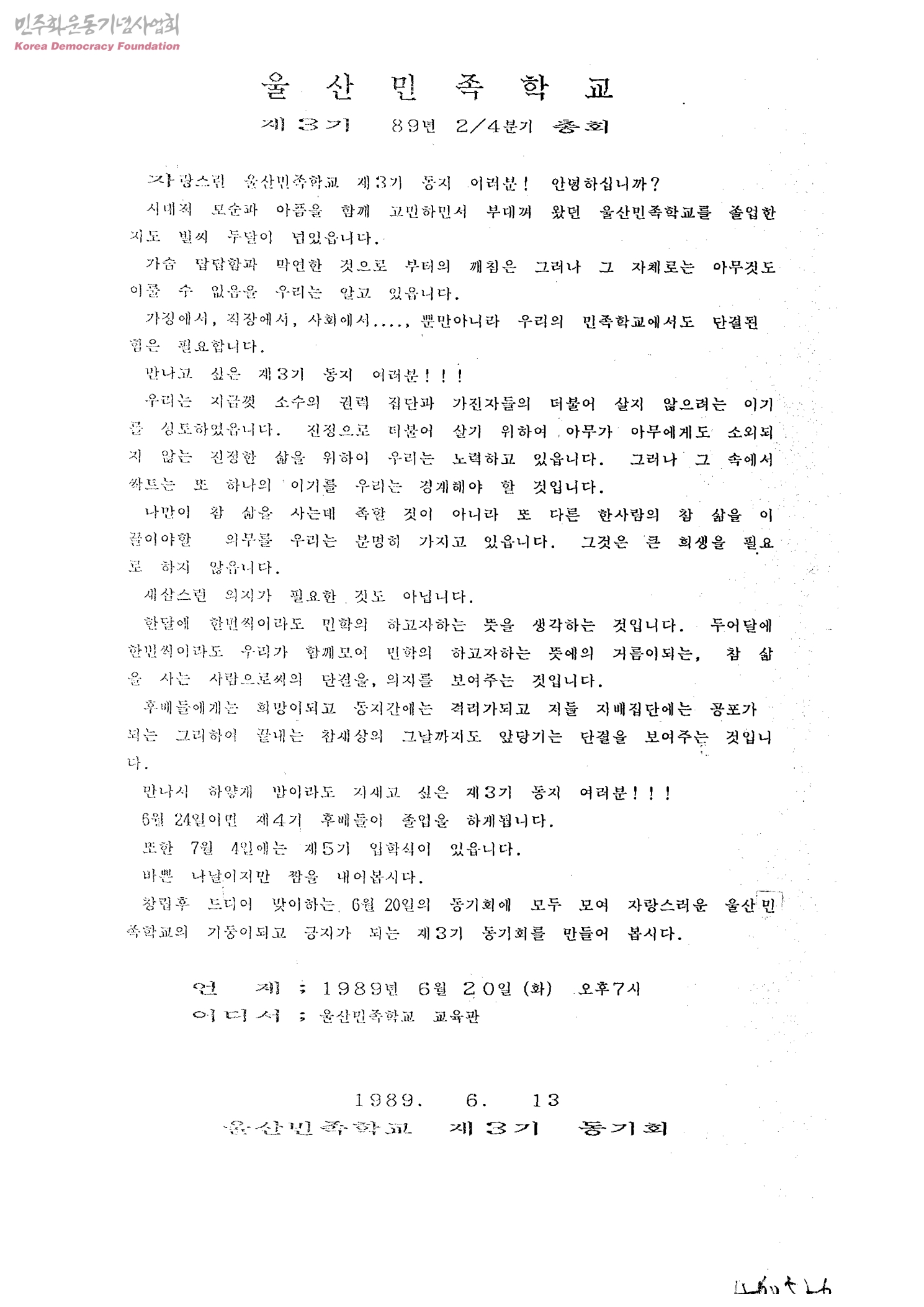 울산민족학교 제3기 89년 2/4분기 총회