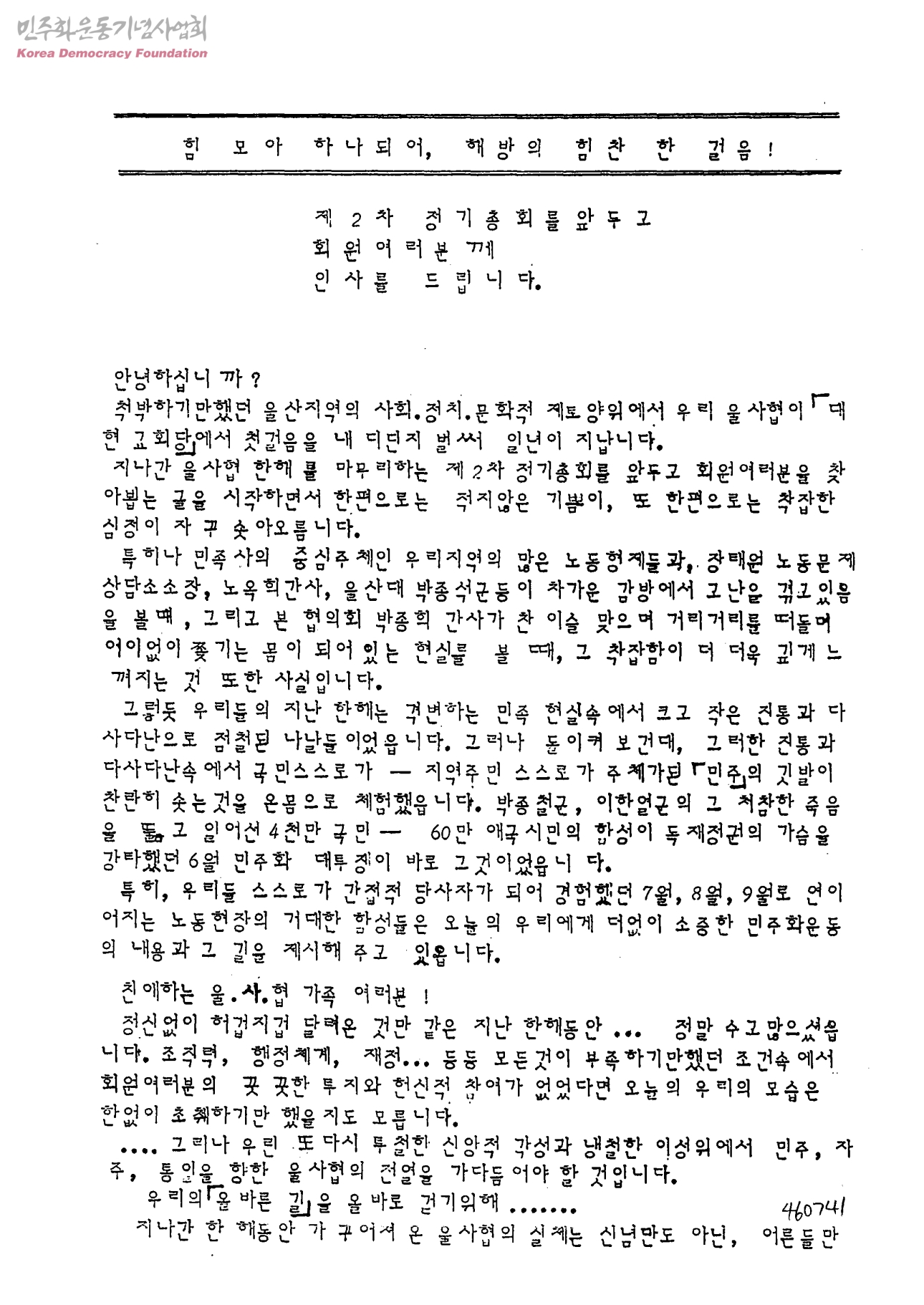 힘 모아 하나되어, 해방의 힘찬 한 걸음!-제2차 정기총회를 앞두고 회원여러분께 인사를 드립니다