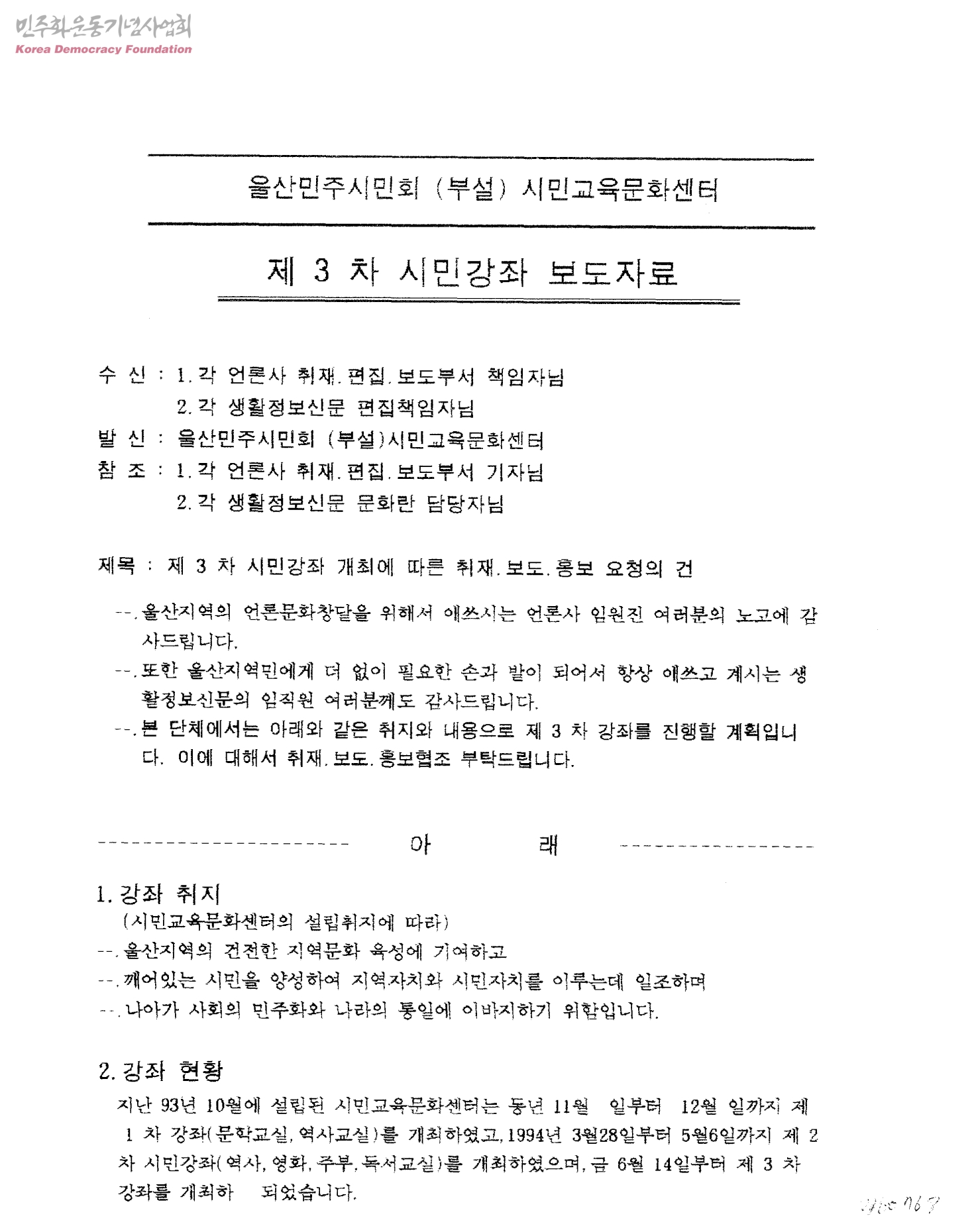 제3차 시민강좌 개최에 따른 취재,보도,홍보 요청의 건[수신:각 언론사 취재,편집,보도부서 책임자님, 각 생활정보신문 편집책임자님, 발신:울산민주시민회 (부설)시민교육문화센터]