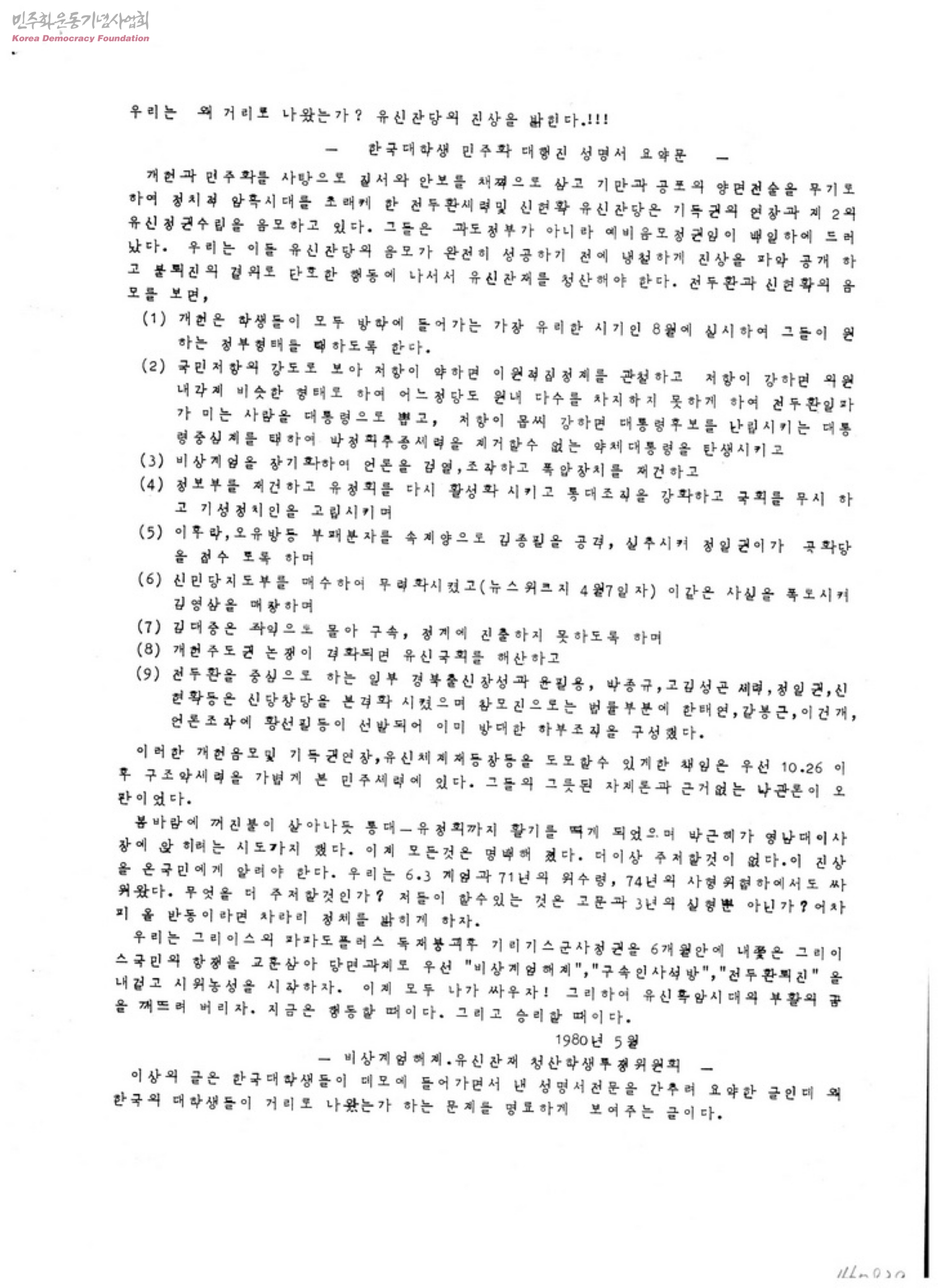 한국대학생 민주화대행진 성명서 요약문
