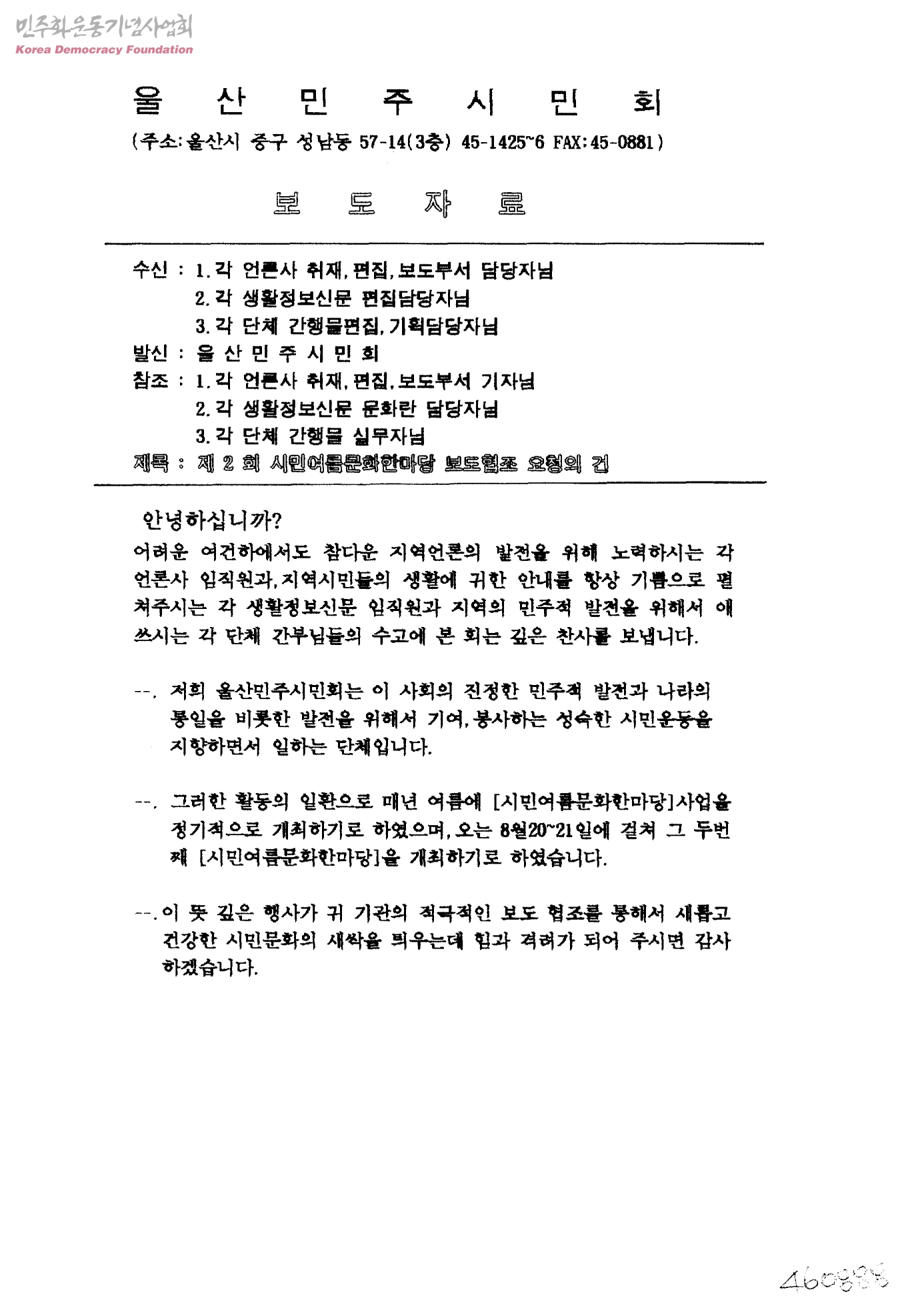 제2회 시민여름문화한마당 보도협조 요청의 건[수신:1.각 언론사 취재, 편집,보도부서 담당자2.각 생활정보신문 편집당담자3. 각 단체 간행물편집, 기획담당자 .발신:울산민주시민회]