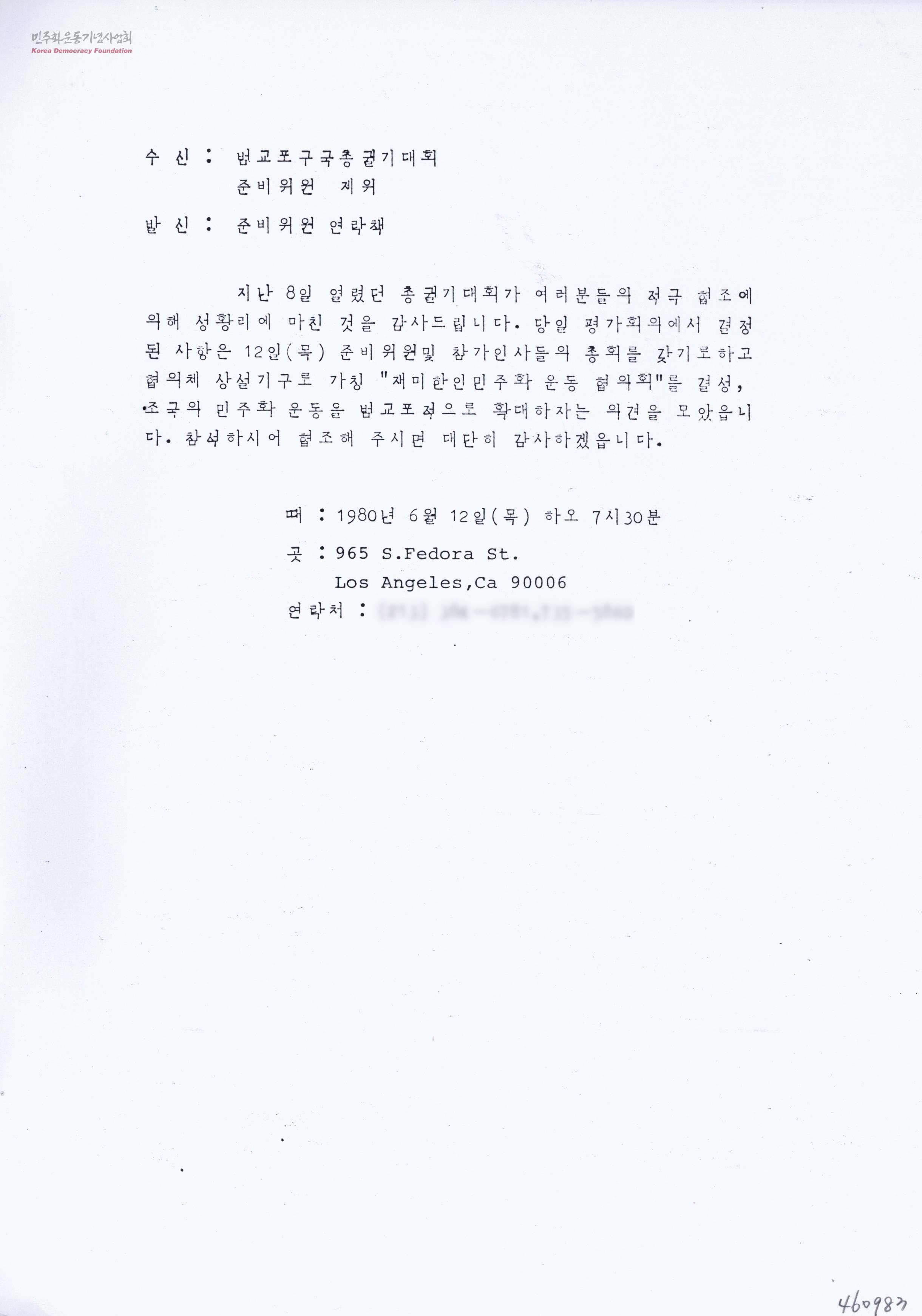 [준비위원연락책이 범교포구국총궐기대회준비위원에 보내는 평가회의와 총횡참석에 관한 수발신문서]