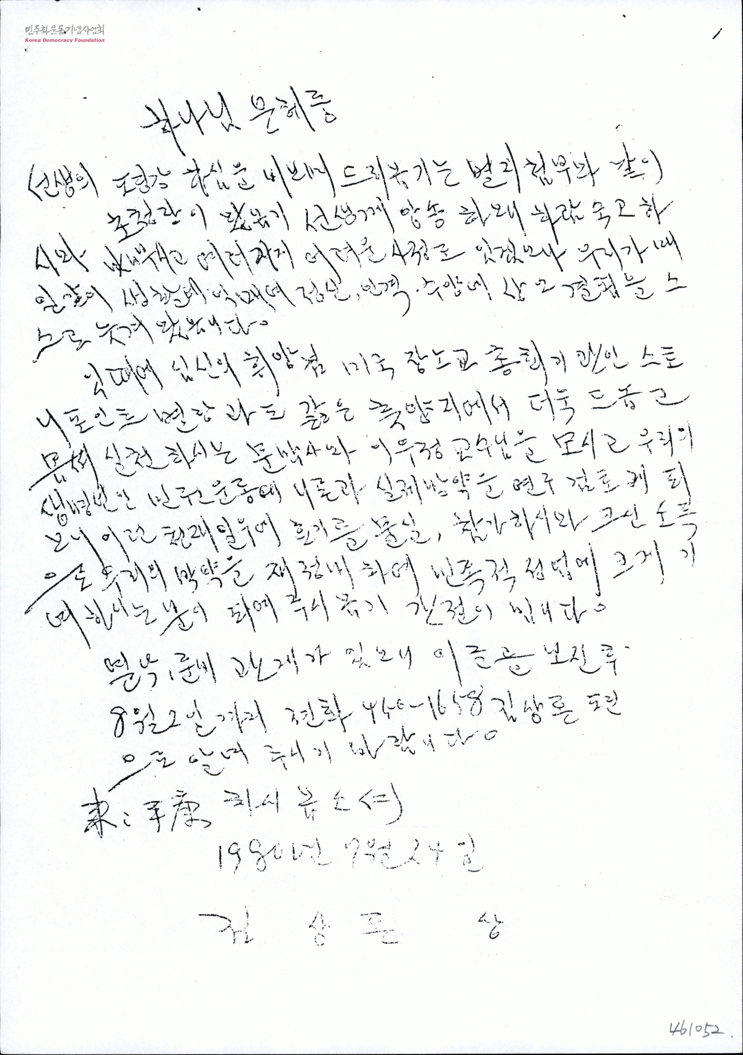 [김상곤이 수신자에 보내는 민권운동 연구검토건에 관한 수발신문서]