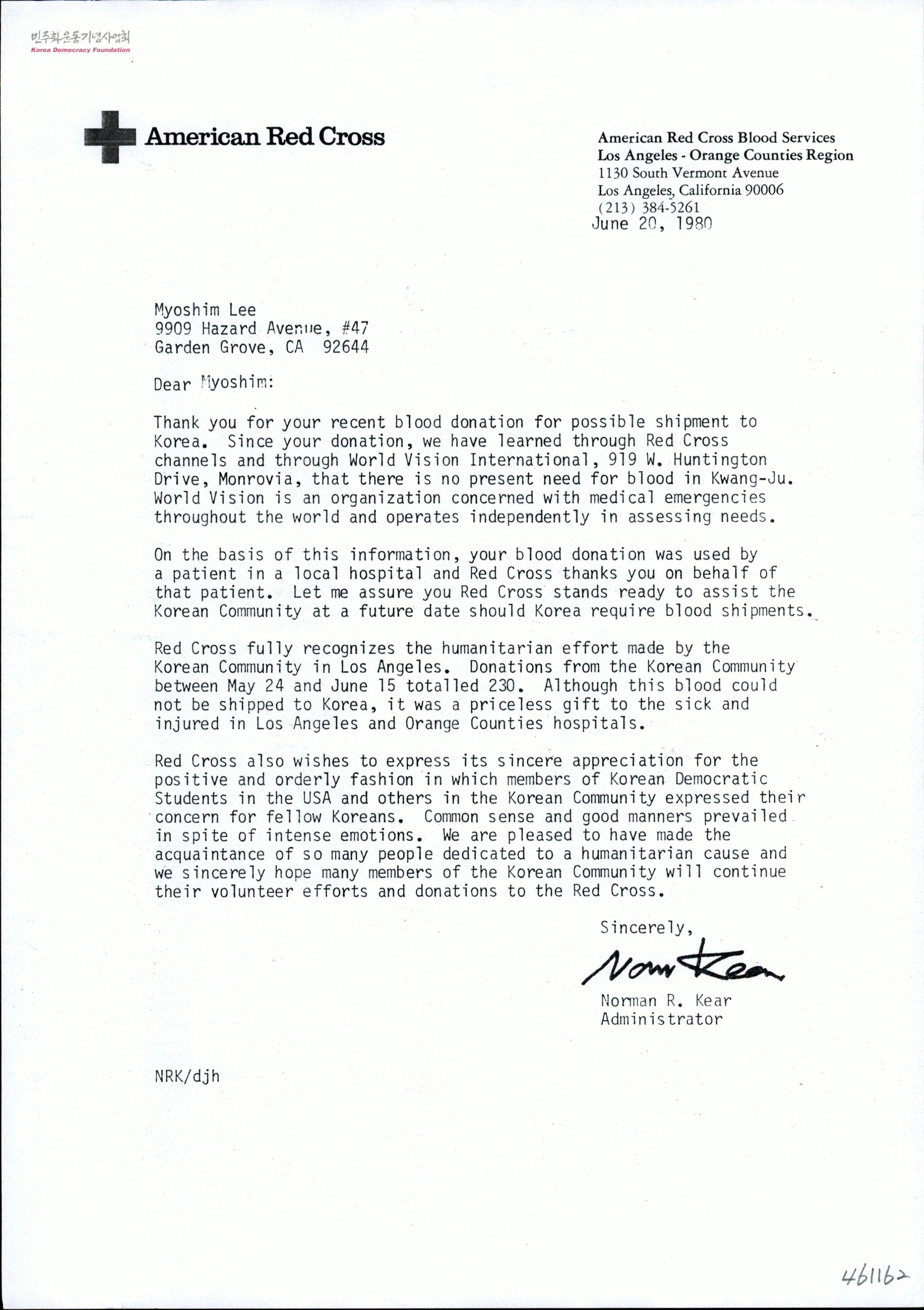 [Norman R. Kear이 Myoshim Lee에 보내는 헌혈감사 수발신문서]