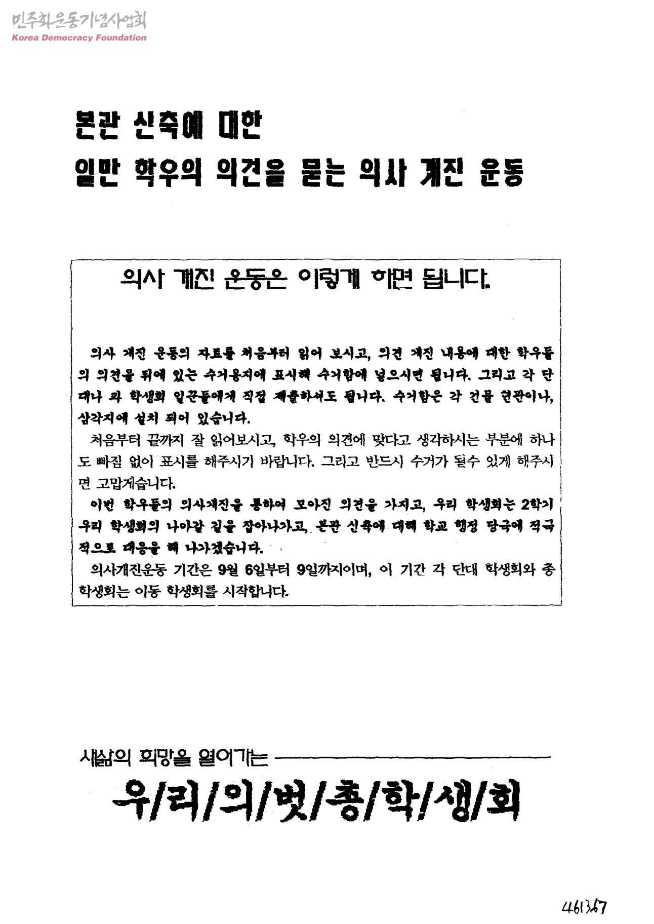 본관 신축에 대한 일만 학우의의견을 묻는 의사 개진 운동