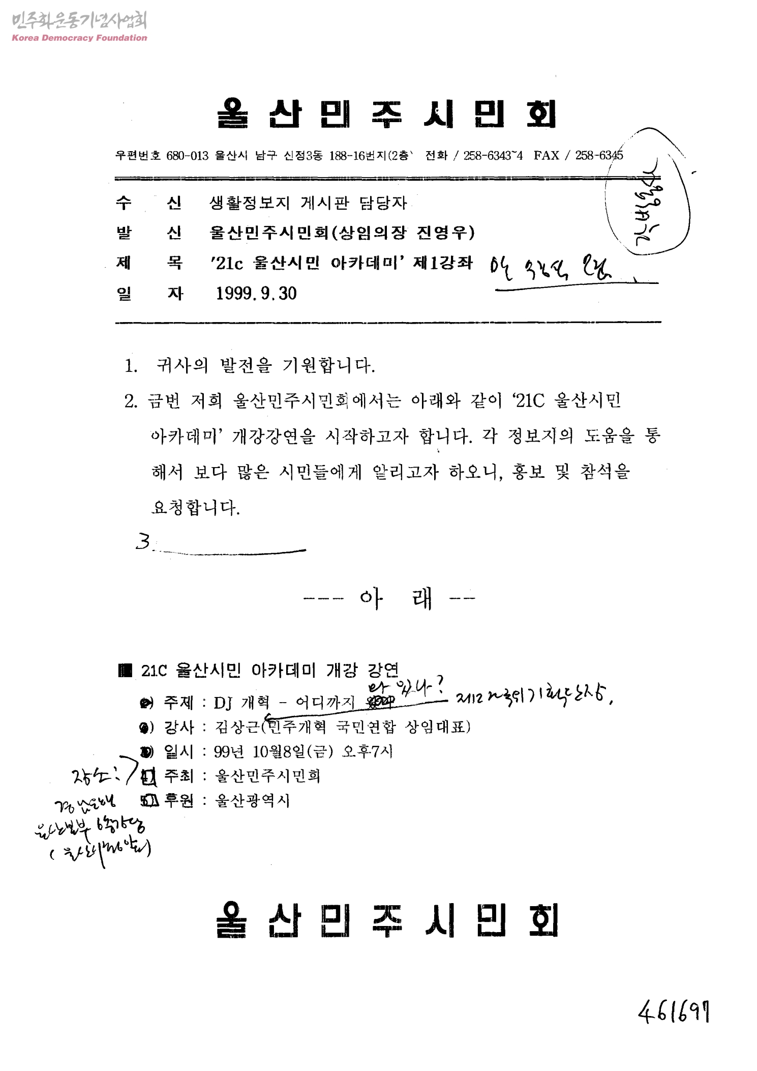 '21C 울산시민 아카데미' 제1강좌[수신: 생활정보지 게시판 담당자, 발신: 울산민주시민회(상임의장 진영우)]