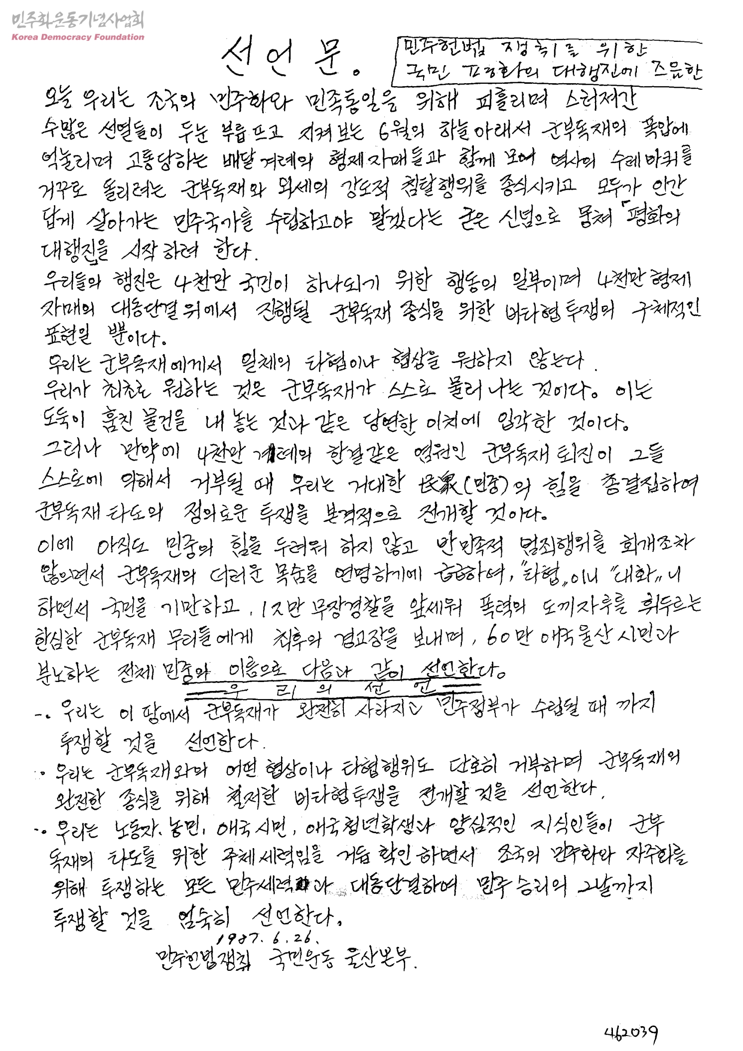 선언문-민주헌법 쟁취를 위한 국민 평화의 대행진에 즈음한