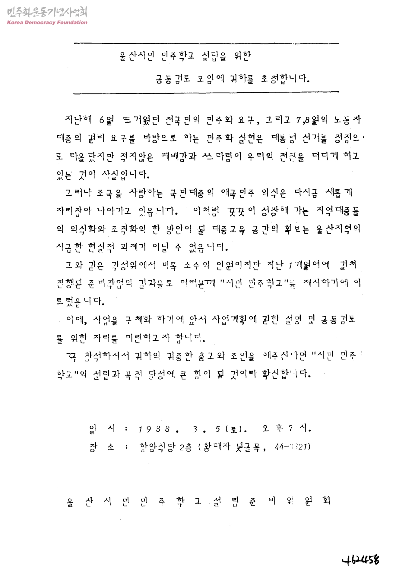 울산시민 민주학교 설립을 위한 공동검토 모임에 귀하를 초청합니다