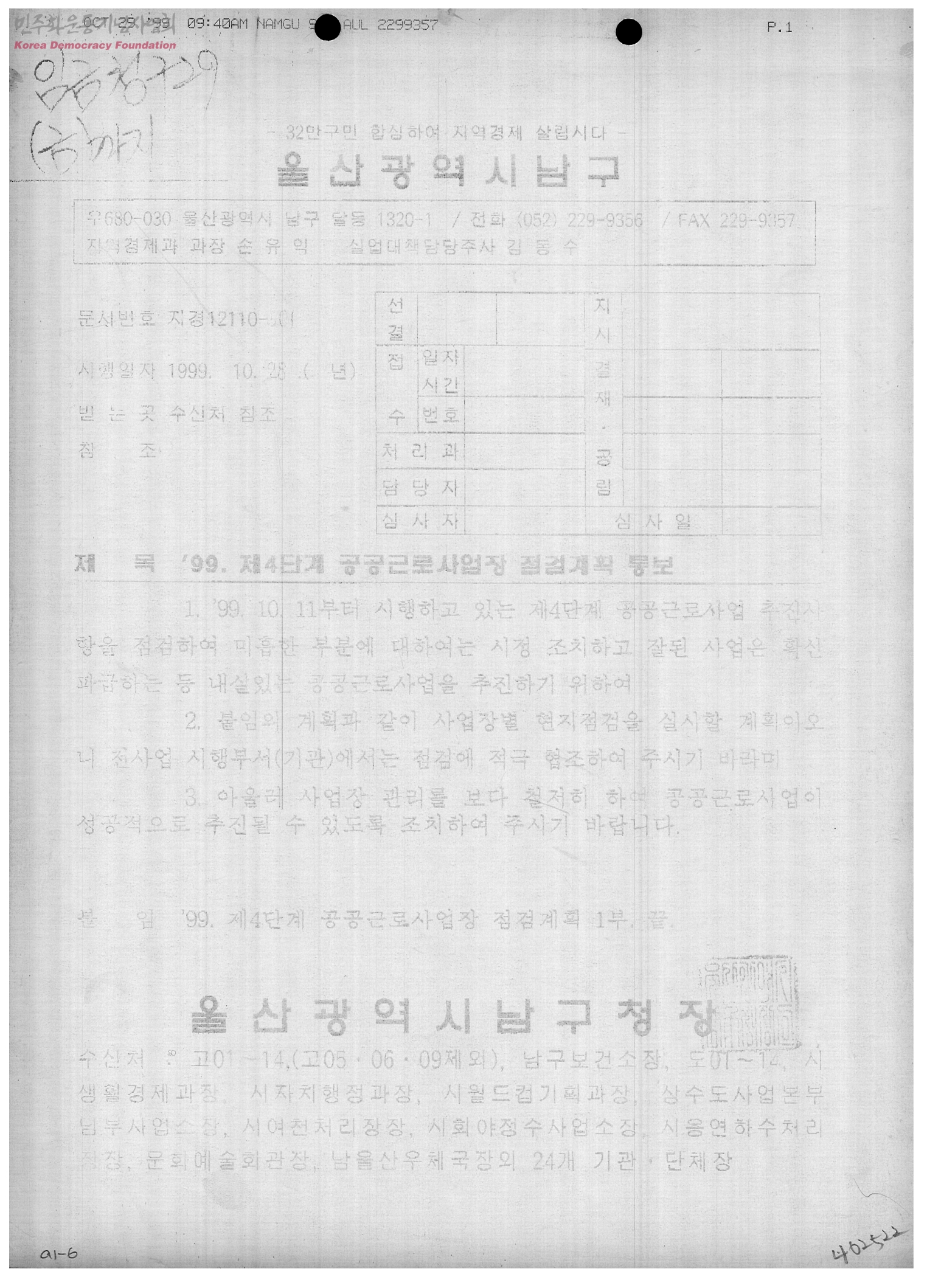 '99.제4단계 공공근로사업장 점검계획 통보[수신: 고01~14(고05 · 06 · 09제외), 남구보건소장, 도01~14, 시생활경제과장, 시자치행정과장, 시월드컵기획과장, 상수도사업본부 남부사업소장, 시여천처리장장, 시회야정수사업소장, 시용연하수처리장장, 문화예술회관장, 남울산우체국장외 24개 기관 · 단체장, 발신: 울산광역시남구청장]