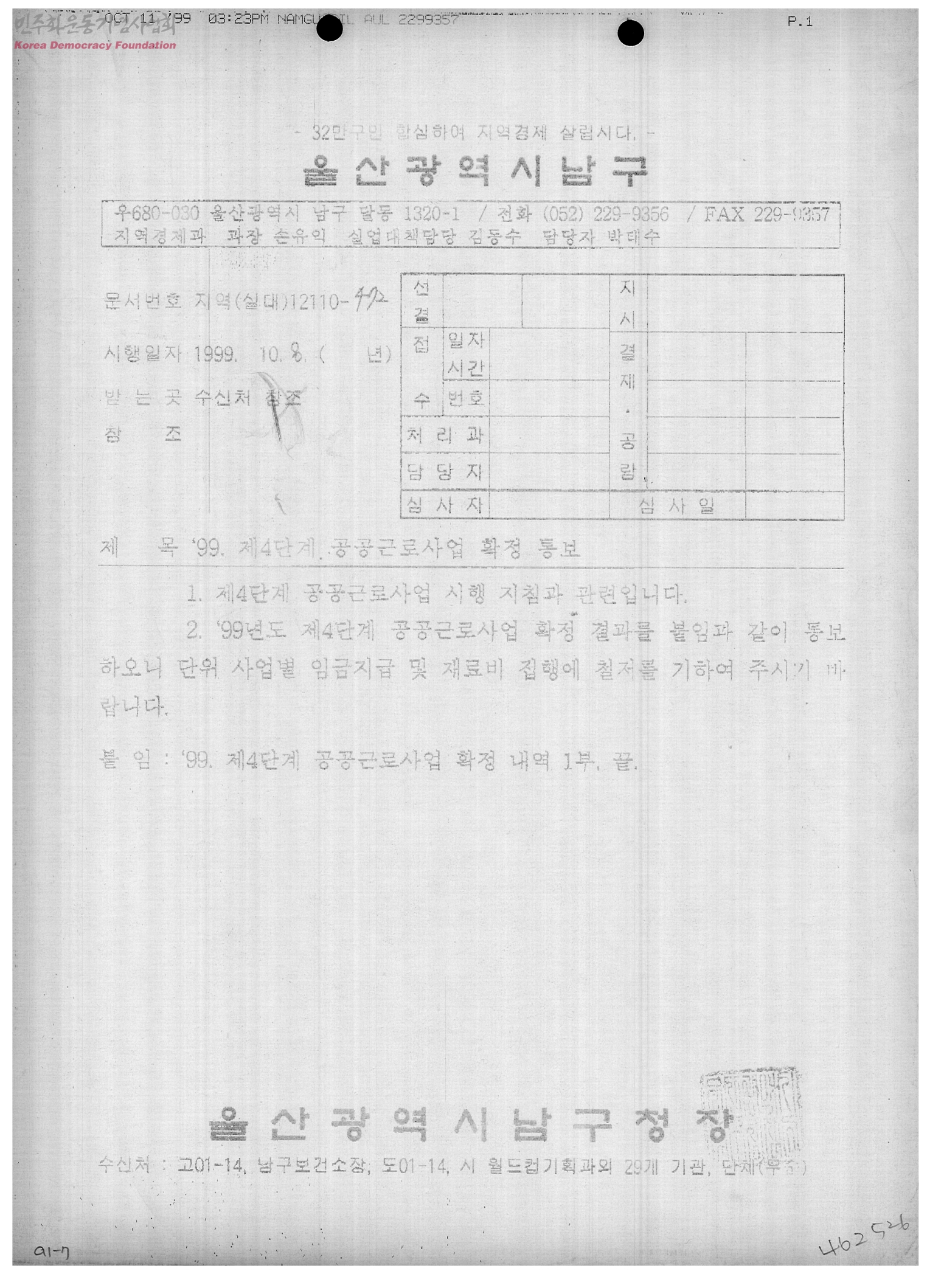 '99.제4단계 공공근로사업 확정 통보[수신: 고01-14, 남구보건소장, 도01-14, 시 월드컵기획과외 29개 기관, 단체]